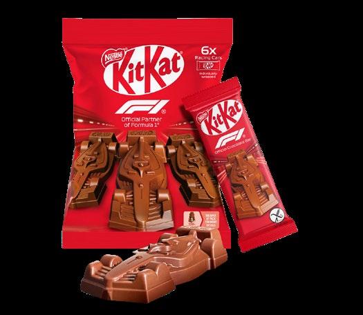 KitKat se ha convertido en el chocolate oficial de la Fórmula 1 y, por tal motivo, lanza dos innovaciones de edición limitada al mercado. La primera es un coche de F1 de KitKat, de chocolate y en tamaño mini, que tiene un interior crujiente, con trocitos de cereales y galleta. El segundo lanzamiento es el KitKat Chunky F1, una barrita que tiene un efecto marmoleado inspirado en la velocidad de los coches de F1.