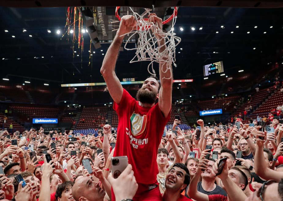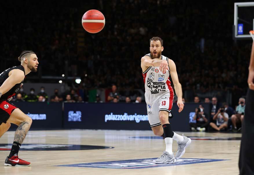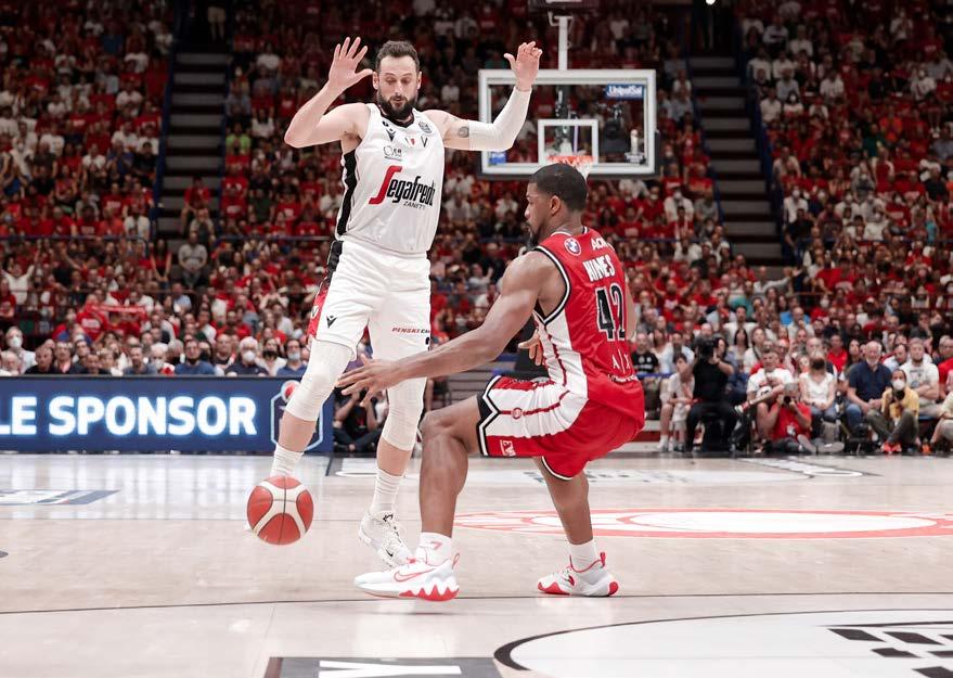 oltre che il 12° dell’era Armani. La forza del la tradizione e della cultura del club è forte. Solo che questa volta è stata valorizzata, forse esaltata, dalla presenza di giocatori carismatici. Kyle Hines è il giocatore più rispettato d’Europa tra gli americani, una specie di leader carismatico di una comunità. Ma in campo è tanto corretto quanto spietato nell’usare le sue armi, forza fisica, intelligenza, desiderio, trattamento di palla, tempismo. Mom Jaiteh, circa 15 centimetri più alto, MVP di Eurocup, era stato un rebus insolubile nei tre precedenti. Bravissimo a prendere posizione vicino al canestro, a ri cevere le fucilate di Milos Teodosic, dotato di mani buone per finire al ferro, e con un vantaggio fisico enorme, aveva segnato 18 punti in tutti i tre precedenti scontri di retti. Ma Hines è arrivato preparato alla sfida più importante. Ha piegato le gambe e l’ha tenuto lontano dall’area il più possibile. Hines è un giocatore che sa essere decisivo anche segnando pochissimo, il trat to caratteristico del più vincente giocatore italiano della storia, Dino Meneghin. Hines è la versione moderna e americana. Ma potrebbe valere anche per Nicolò Melli, un altro giocatore che è disposto ad annullare sé stesso e il proprio ego per una vittoria. Scherzando dice sempre di essere stato nominato “co-capitano” dell’Olimpia perché si fidano di lui, sì, ma non del tutto. Per tutta la stagione, Melli è stato una presenza fissa nell’Olimpia, EuroLeague (dov’era sempre partito in quintetto) e campionato. Poi nel momento più importante della stagione, durante i playoff di EuroLeague, si è bloccato. Primo infortunio della sua stagione. Melli è un lavoratore incredibile, che ha una cura maniacale del proprio corpo. Quando si è infortunato la sera di Gara 1 avrebbe voluto stringere i denti e giocare Gara 2. Poi si sarebbe presentato in Gara 5 se ci fosse sta ta. Alla fine, ha saltato un mese abbondante, incluso il primo turno dei playoff. Un vero Capitano, come il partner Sergio Rodriguez.