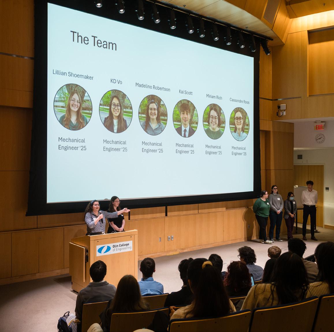 A team of four Olin College students and one Stanford University undergraduate won the first-place prize for Terraflex, their AIpowered prosthetic foot attachment, at the Entrepreneurship & AI Buildathon co-hosted by Babson College’s interdisciplinary AI Lab and the Cambridge, MA arm of Microsoft Research. The students also took home the Nature-Inspired Design Prize. Congratulations to Darian Jimenez ’27, Gabe Zak ’25, Rhea Rastogi ’28 (Stanford), Maya Adelman ’27, Jeffrey Woodyard ’27.
