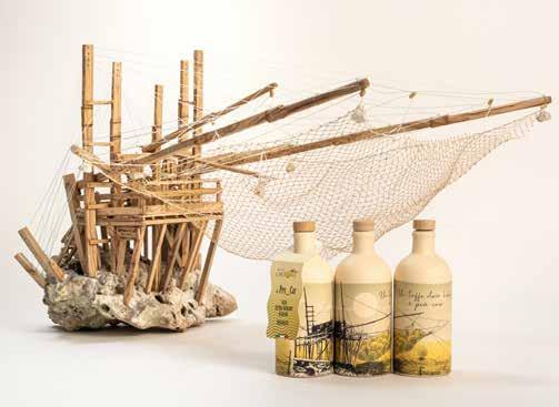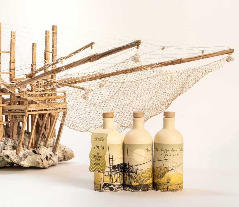 C’è anche un altro aspetto, molto interessante, che riguarda le analogie tra le reti da pesca e quelle per la raccolta delle olive. Quest’ultime, “dispiegate sotto gli olivi - come giustamente osserva Mastroeni - ricordano le onde del mare”. Altra analogia: “le forme ovali delle olive ricordano le forme dei galleggianti delle reti da pesca”. E ancora: “le stesse forme delle foglie dell’olivo ricordano non solo le forme fusiformi dei pesci, ma anche quella dei gozzi, le barche dei pescatori liguri”. Questa idea di prendere quale soggetto di design il tema portante di Olio Officina Festival 2025 ci ha fatto molto piacere, segno che da alcune idee ne possono scaturire altre in una sorta di interconnessione virtuosa. E così, sulla stessa linea d’onda si è mossa un’impresa olearia pugliese, il Frantoio Ortore di Carpino, sul Gargano. Ogni volta la famiglia Ortore trae spunto dal tema del festival. Per le Forme dell’olio 2025 ha presentato un lavoro, “Pes_Car”, dove ha unito insieme mare (Peschici) e terra (Carpino), con una ceramica d’autore sulla quale ha rappresentato un trabucco - quest’ultimo, oltre a essere riprodotto sull’orcio in ceramica, lo abbiamo peraltro ricevuto, quale pezzo unico, in una fantastica riproduzione in miniatura. “L’orcetto a edizione limitata - ha chiarito Isabella Ortore - arricchisce ulteriormente la nostra collezione”; ed effettivamente nel loro frantoio l’arte, insieme con l’artigianato, è presente ovunque. E così, parafrasando una canzone degli anni Ottanta della Formula 3, campeggia il motto “un tuffo dove l’olio è più cru”: “un mare d’olio, un trabucco, le reti piene di olive, il nostro olio dal gusto persistente e ricco, che ricorda la forza e la determinazione delle piante di ulivo e degli olivicoltori, legati come noi