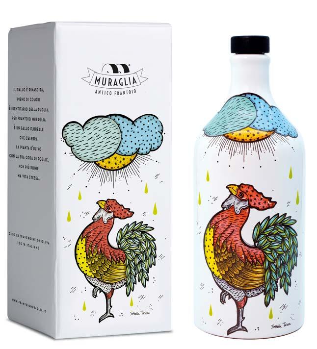 Un’avventura che prosegue grazie all’estro e alla creatività degli artisti coinvolti: un dialogo tra un prodotto di alta qualità e l’estro dei creativi, nel nome della tradizione, ma per rivoluzionarla. Se fino adesso, infatti, negli orci del Frantoio Muraglia abbiamo parlato della nostra storia, ora vogliamo aprirci a nuove strade e rivoluzio nare una vera icona pugliese della terracotta: l’immagine del gallo. Come? Con un altro orcio in terracotta di design, stavolta ideato dalla desi gner Stella Tasca e ispirato proprio al gallo della nostra tradizione.