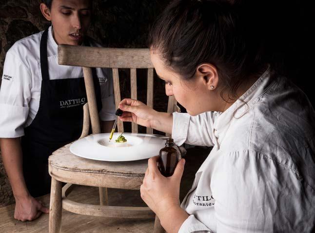 I loro ospiti possono rilassarsi nei giardini ristrut turati e studiati per un relax sempre più immer sivo, oltre a una piscina ben congegnata, adatta per svago e sport. “Il connubio tra sostenibilità e gusto - sostiene Caterina Ceraudo - è ciò che ricerchiamo quotidianamente. La mia è una cre atività estemporanea, vivace ma concreta, senza voli pindarici. Dialogo ogni giorno con gli artigiani della mia terra perché il mio obiettivo è offrire piatti pieni di sapore e soprattutto di identità ter ritoriale”. E non può essere diversamente, vista l’azienda di famiglia.