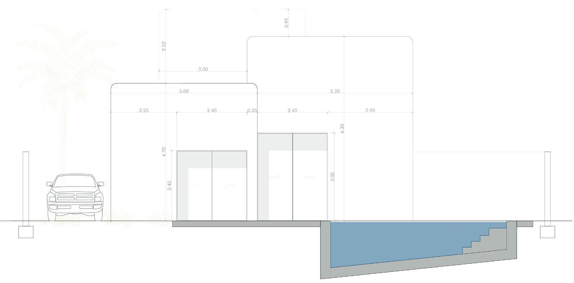 Piscine de plan rectangulaire de 5x3 m avec profondeur d’eau uniforme, avec plage et escaliers à l’intérieur de la piscine, y compris l’equipement d’épuration, revêtement en microciment, 1 projecteur subaquatique et aspirateur.