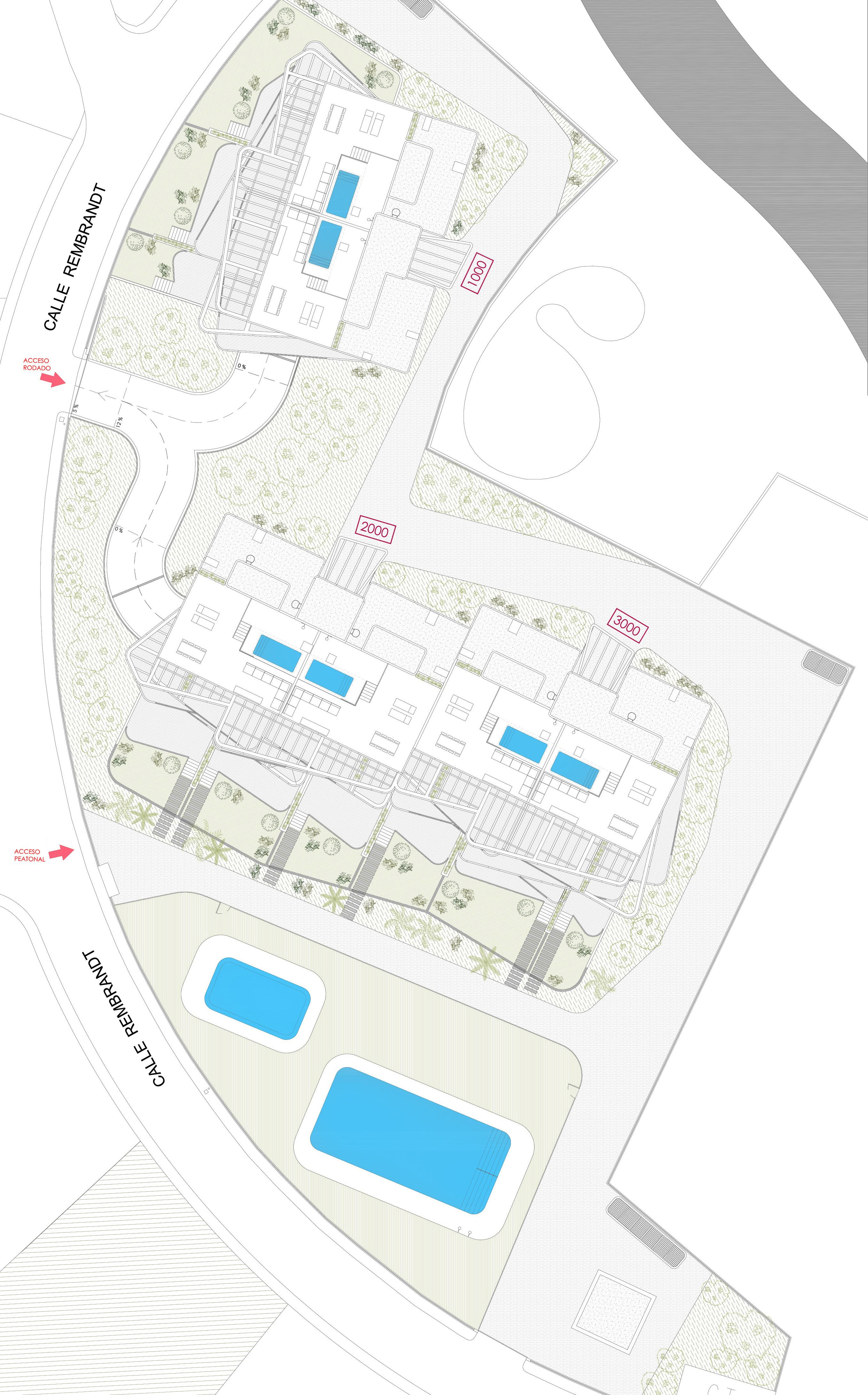 Mediterranean type garden in the entire residential complex with low water consumption plants. Automatic exterior irrigation.