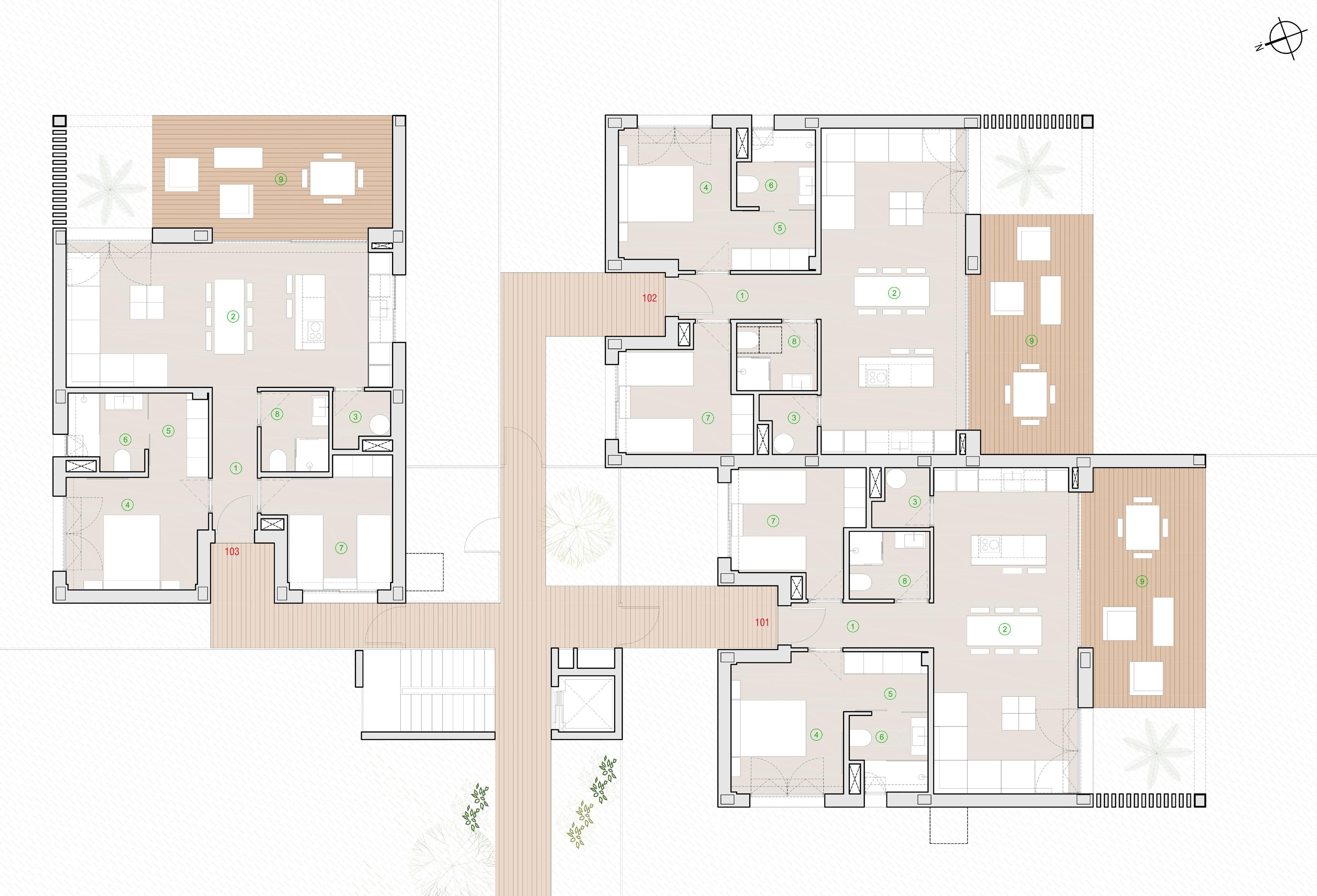In bathrooms, the shower cabins will be covered with a GRESPANIA porcelain plate, format 30 x 90, placed horizontally. The rest of the bathroom will be finished with washable matt enamel paint in white RAL 9010.