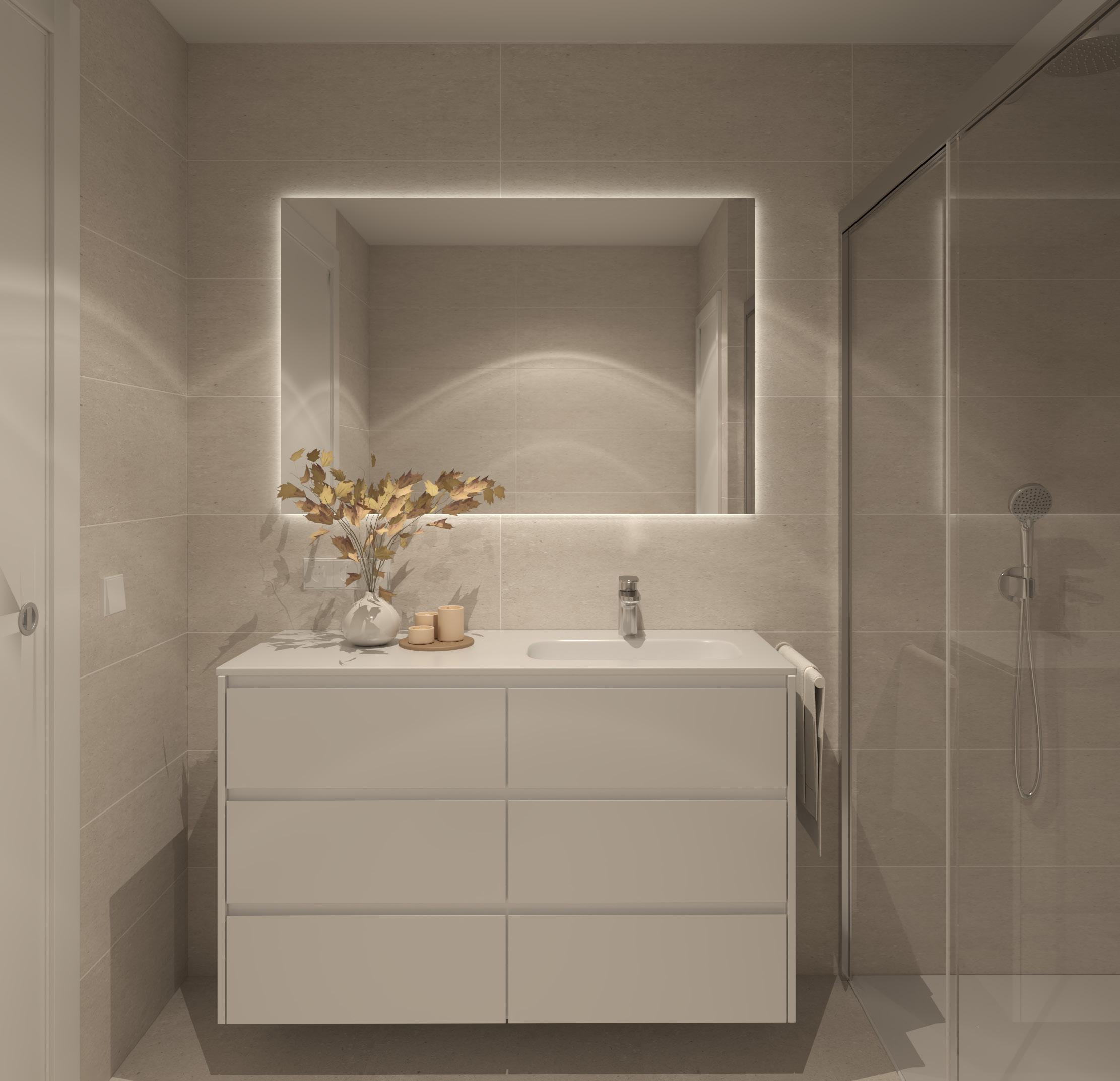 Dans les salles de bains, le revêtement des cabines de douche sera réalisé avec des plaques de grès cérame de BELLACASA Lucena Perla 30x90, disposées dans le sens horizontal. Pour le reste de la salle de bains, la finition sera réalisée avec de la peinture à l’émail lavable de couleur blanche RAL 9003.