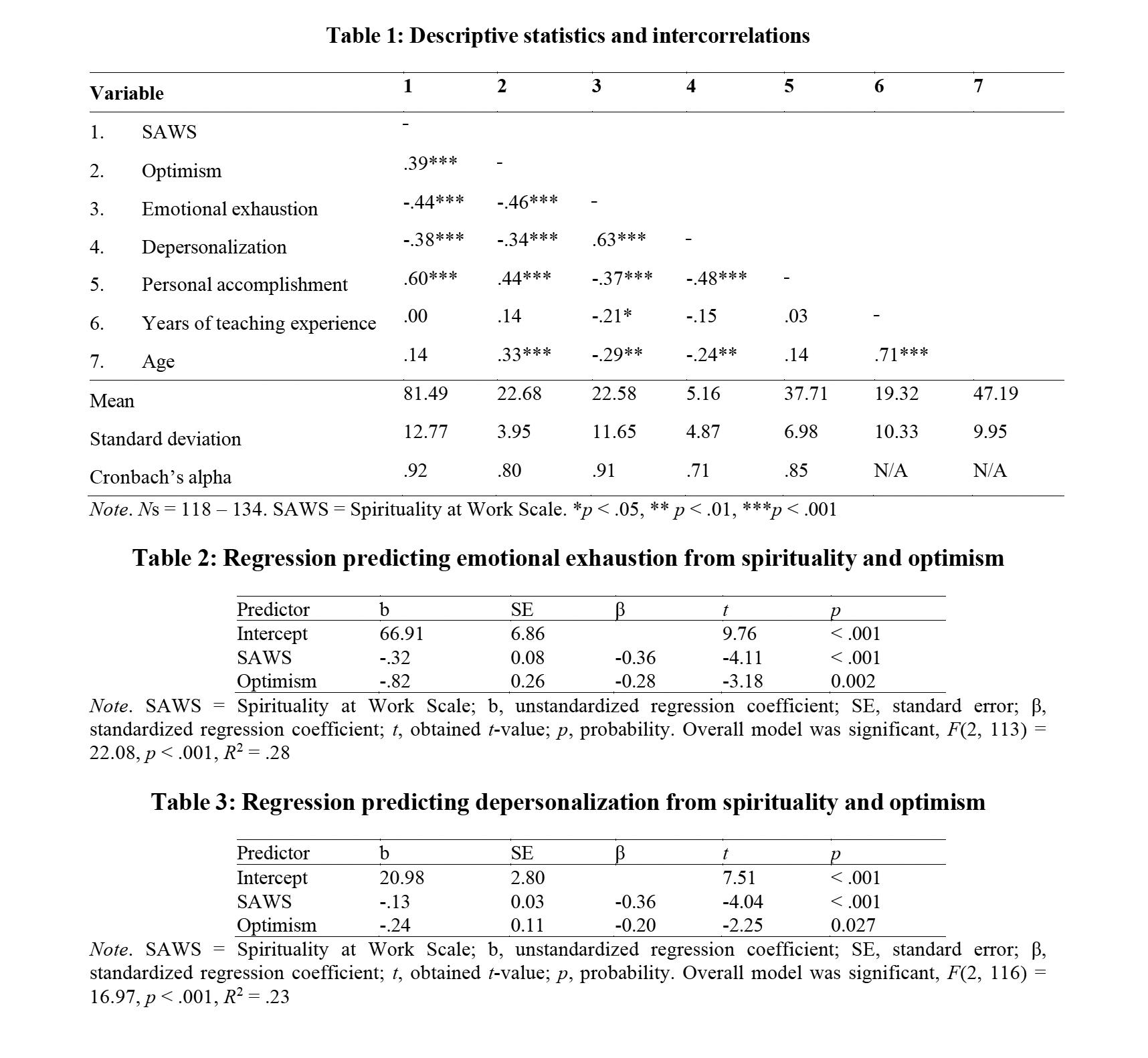 Correlations between the major variables of interest appear in Table 1. All correlations between the predictors (e.g., spirituality and optimism) and the three facets of burnout are significant (all have p-values <.01) and moderate in magnitude, with the highest correlation between spirituality and personal accomplishment (.60), and the lowest correlation between optimism and depersonalization (-.34). The two predictors, spirituality and optimism, are also positively and moderately correlated (.39).