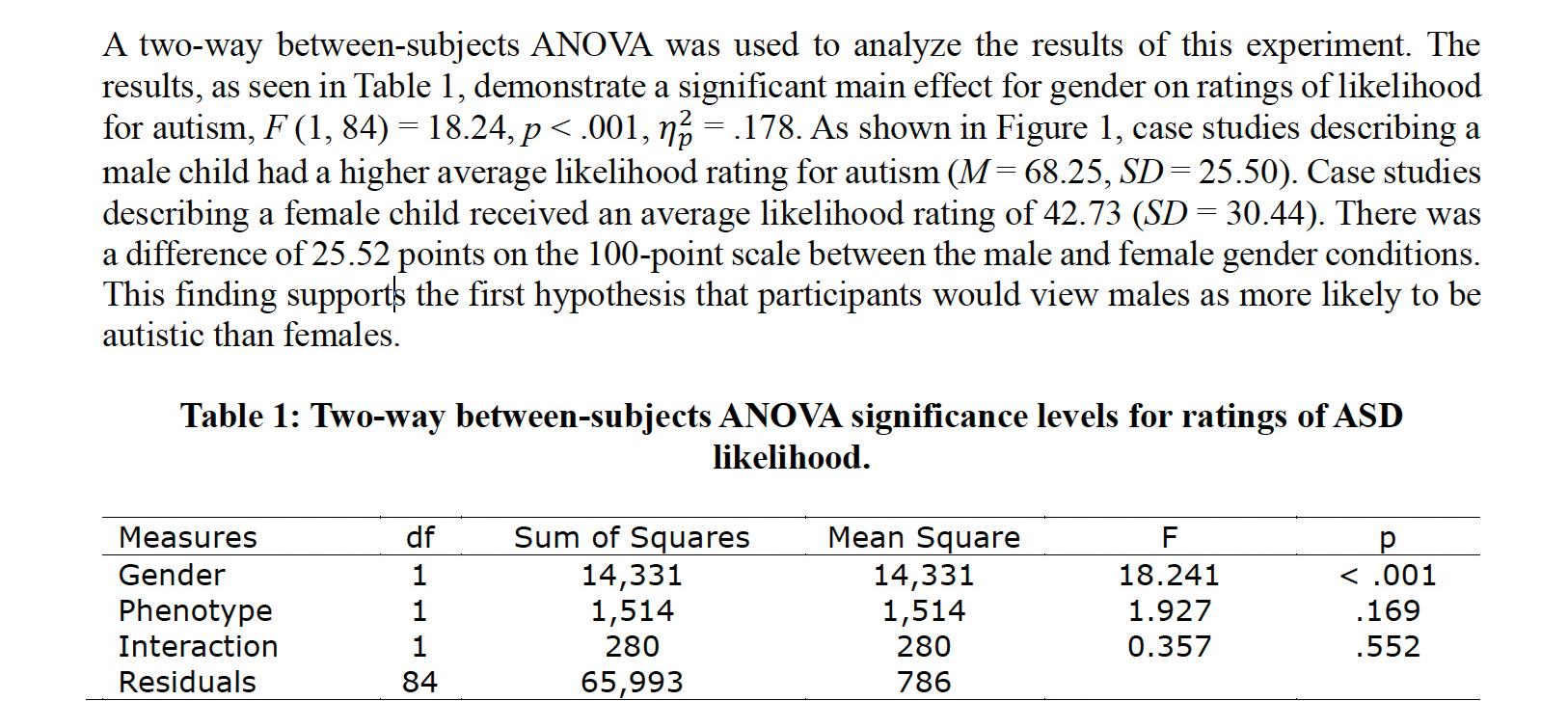 Additionally, future research could examine the potential impact of education on perceptions of autism in females. If participants are given some amount of information at the beginning of the study, about either autism in general or autism in females, would their responses change? Based on the results of this study, it could be replicated, keeping gender as one of two independent variables. The second independent variable could be education. Before assigning case studies and questionnaires, researchers could randomly assign participants to an experimental condition, giving them information about autism, or a control condition, giving them information about some other topic. Then participants would be randomly assigned to a male or female case study and asked to give likelihood ratings. If the experimental group responds with higher ratings of likelihood for autism, either in the female group or for both gender groups, it could indicate that education can help ameliorate the lack of understanding of autism in females.