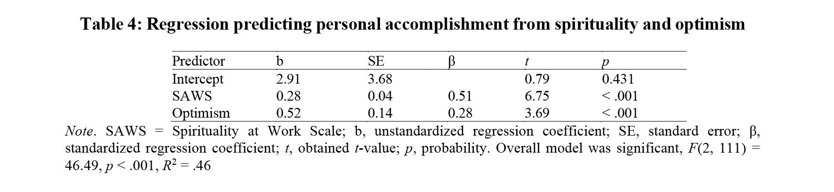 Multiple regression was used to predict each facet of burnout from optimism and spirituality. The overall regression for emotional exhaustion was significant. Of the predictors investigated, both optimism were significant predictors of emotional exhaustion (Table 2). The overall regression for depersonalization was significant. Of the predictors investigated, both optimism and spirituality were significant predictors of depersonalization (Table 3). The overall regression for personal accomplishment was significant. Of the predictors investigated, both optimism and spirituality were significant predictors of personal accomplishment (Table 4).