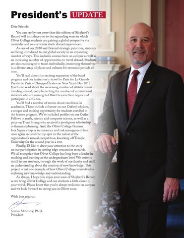 Dear Friends: You can see by our cover that this edition of Shipherd’s Record will introduce you to the expanding ways in which Olivet College students are gaining a global perspective via curricular and co-curricular study abroad experiences. As one of our 2020 and Beyond strategic priorities, students are being introduced to our global society in an expanding number of ways. This includes courses here on campus as well as an increasing number of opportunities to travel abroad. Students are also encouraged to travel individually, immersing themselves in a diverse array of places and cultures for extended periods of time. You’ll read about the exciting expansion of the band program and our invitation to travel to Paris for La Grande Parade de Paris – Champs-Élysées on New Year’s Day 2016. You’ll also read about the increasing number of athletic teams traveling abroad, complementing the number of international students who are coming to Olivet to earn their degree and participate in athletics. You’ll find a number of stories about excellence in academics. These include a feature on our Oxford scholars, a unique and exciting opportunity for students enrolled in the honors program. We’ve included profiles on our Cutler Fellows in math, science and computer science, as well as a piece on Trent Strang who received a prestigious scholarship in financial planning. And, the Olivet College Gamma Iota Sigma chapter in insurance and risk management has once again secured the top spot in the nation at the organization’s annual competition, knocking off Temple University for the second year in a row. Finally, I’d like to draw your attention to the story on our participation in cutting edge concussion research. We all recognize that Olivet College has long been a leader in teaching and learning at the undergraduate level. We strive to instill in our students, through the work of our faculty and staff, an understanding about the creation of new knowledge. This project is but one example of how Olivet College is involved in exploring new knowledge and understanding. As always, I hope you enjoy your issue of Shipherd’s Record as we bring Olivet College and our students a little closer to your world. Please know that you’re always welcome on campus and we look forward to seeing you in Olivet soon. With best regards,