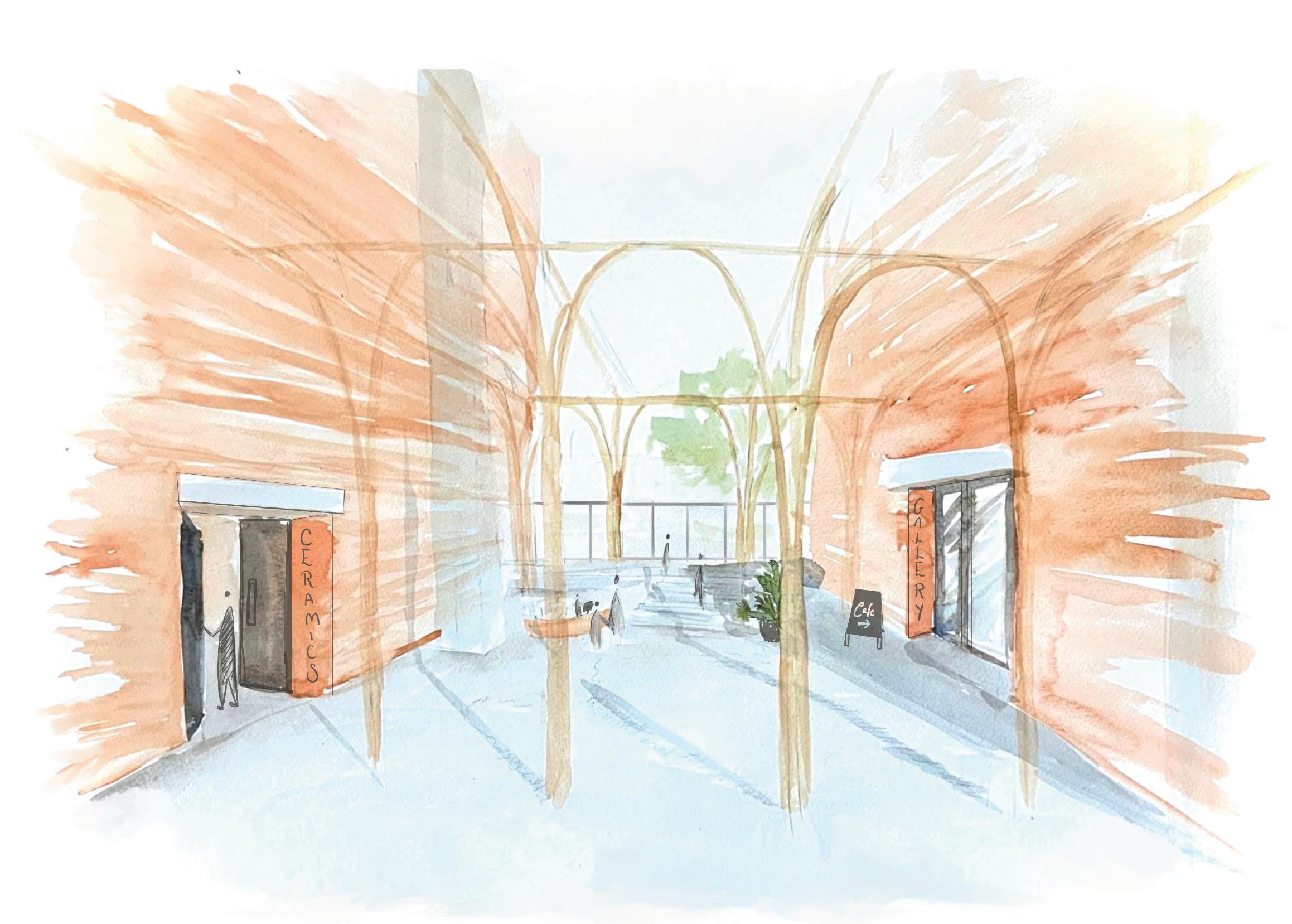 My architectural design creates a hub of interconnectivity, a safe, secure space providing practical services at a pace suitable for ‘the individual’. Through the medium of clay, communication at various levels can be initiated, practically and verbally, encouraging new friendships, fun and laughter, surrounded by the new green holistic spaces.