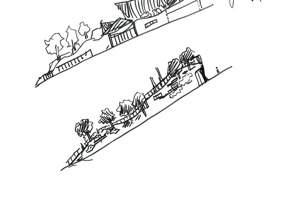 This watercolour shows the slope of the copper roof and the phenomenological Journey of the rain water running down and leaving the oxidisation pattern on the surface. This water finishes its journey in a rockery and pond.