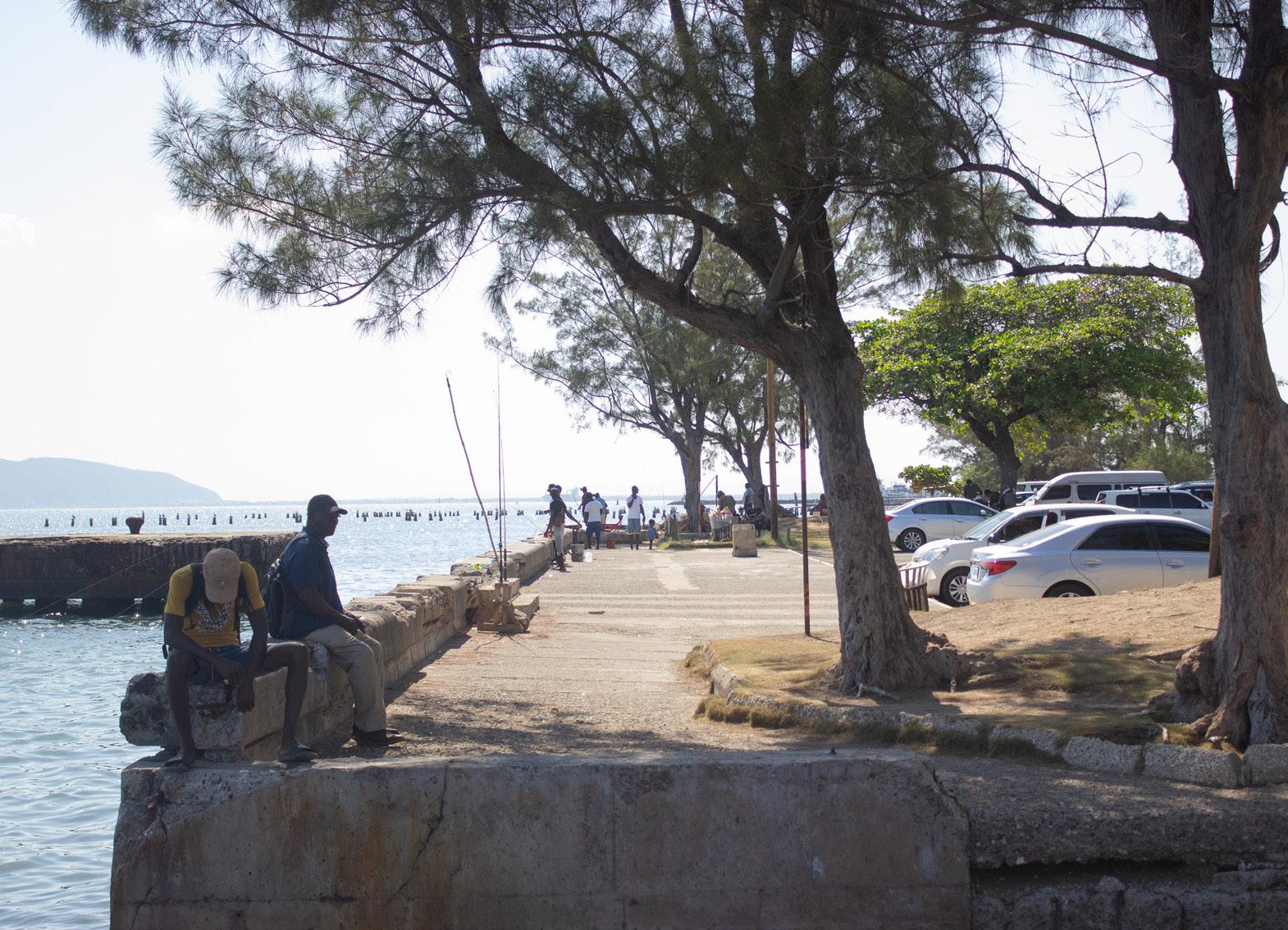 Side view of Waterfront with fishermen and passerby