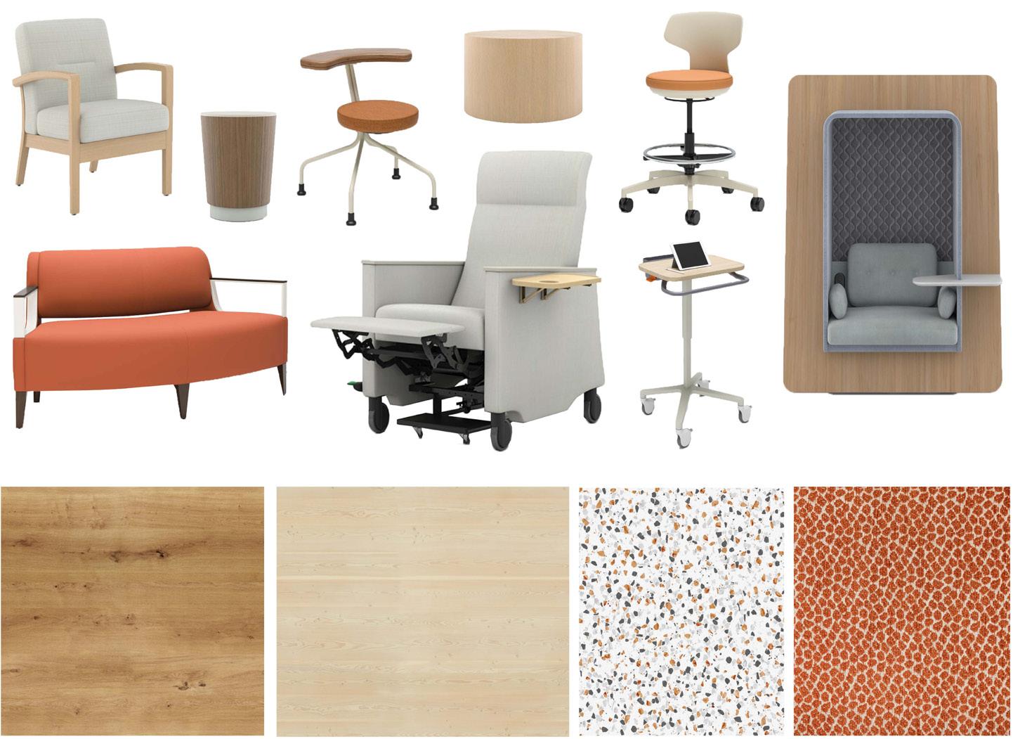 Regarding FF&E selections, the use of natural colors, textures, and materials assist in the creation of a calming, nurturing atmosphere.