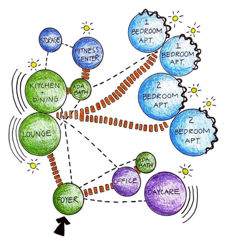 The layout encourages social connection and togetherness through the placement of the communal kitchen and lounge near both of the primary entrances. The circulation is clearly navigable with a direct pathway that supplies entrance to each individual space. As residents walk in the main entries and towards the apartment units, they experience the gradual transition from the most public spaces, to semi-public, semi-private, and finally private. Each space provides flexibility to offer residents the choice of deciding the level of social interaction desired.