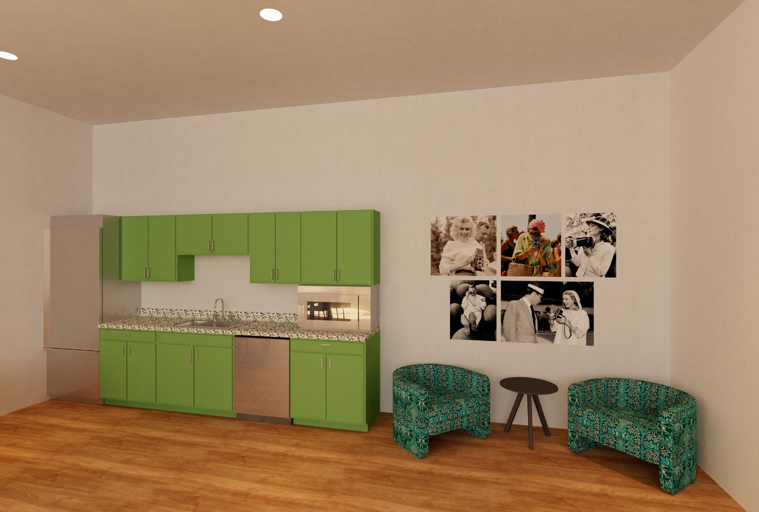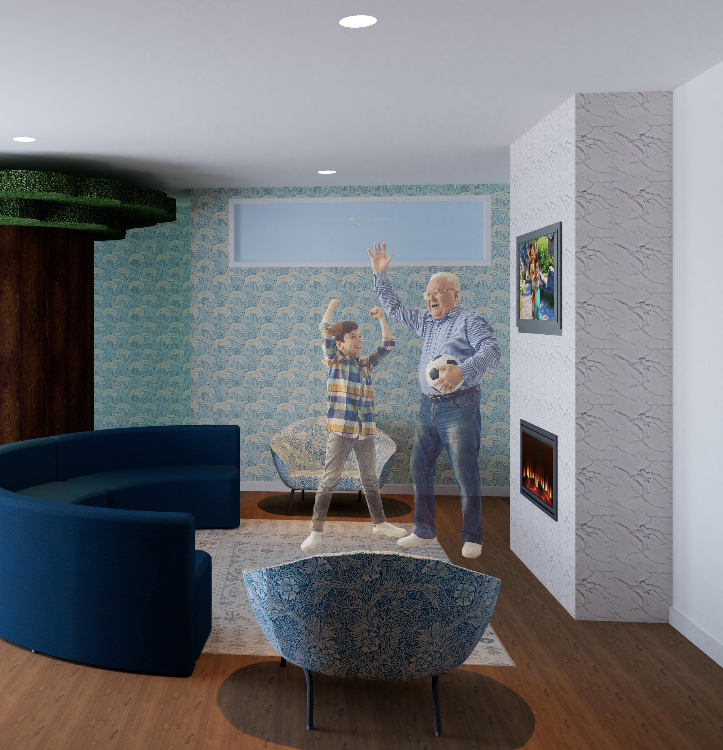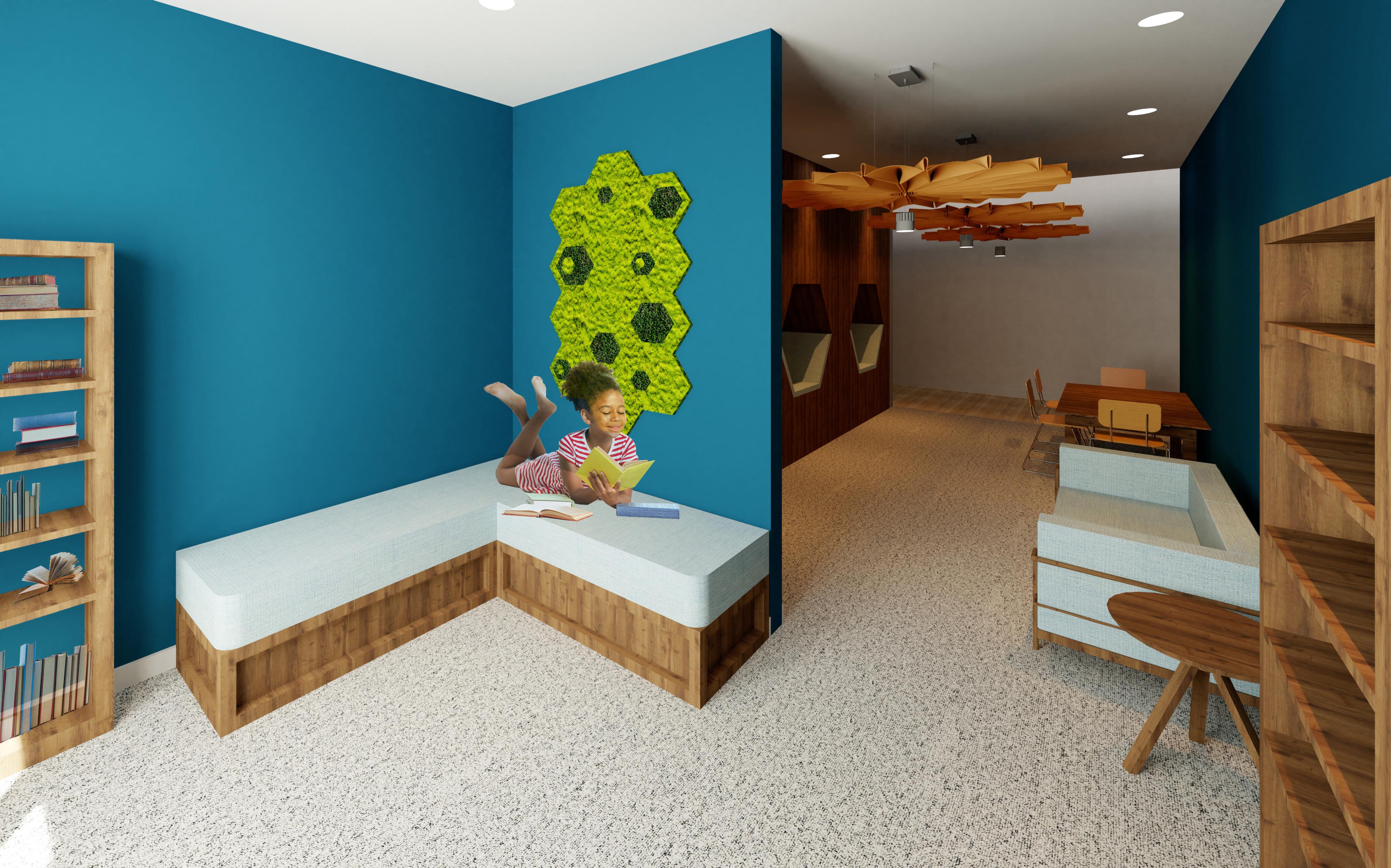 The furniture selections provide comfort to exude a feeling of homeyness and support inclusivity by allowing all residents to safely occupy the spaces. Furthermore, the design choices incorporate details of biophilia through use of natural materials like wood, calming shades of blue and green, and naturalistic textures and patterns. Not only is this a way to create a relaxing environment that connects occupants to the outdoors, but it symbolizes the mission of growth and flourishing.