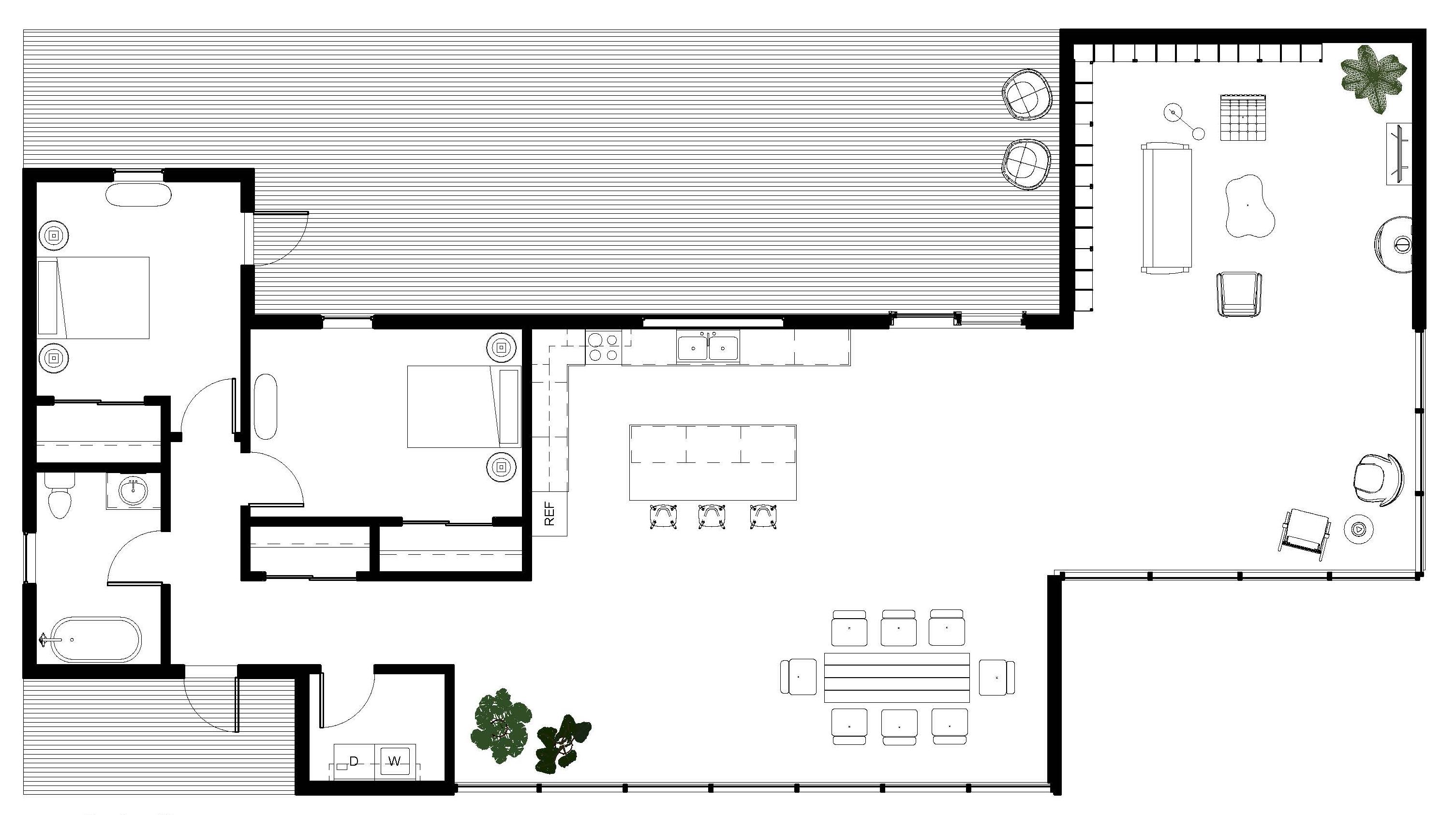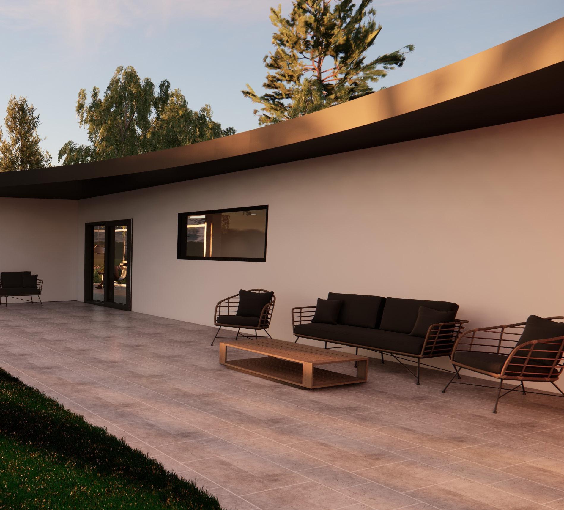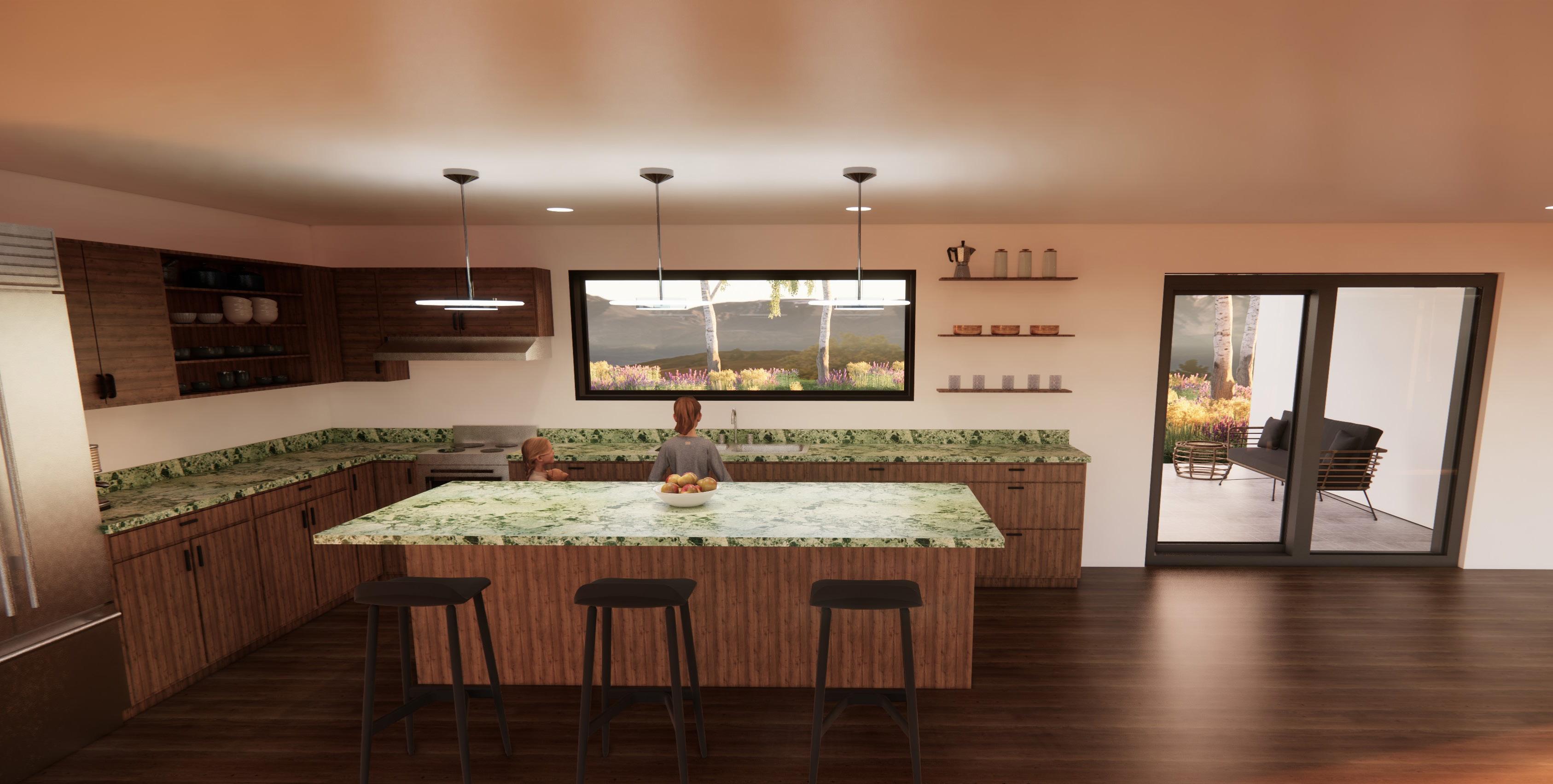 The design process of the modern home involved sufficient research in order to inform the space’s layout, exterior and interior details, and FF&E selections. The single story home considers the importance of simplicity, order, and access to daylight. The curtain walls work to evoke the mid-century modern style as well as connect the occupants with breathtaking views of nature.