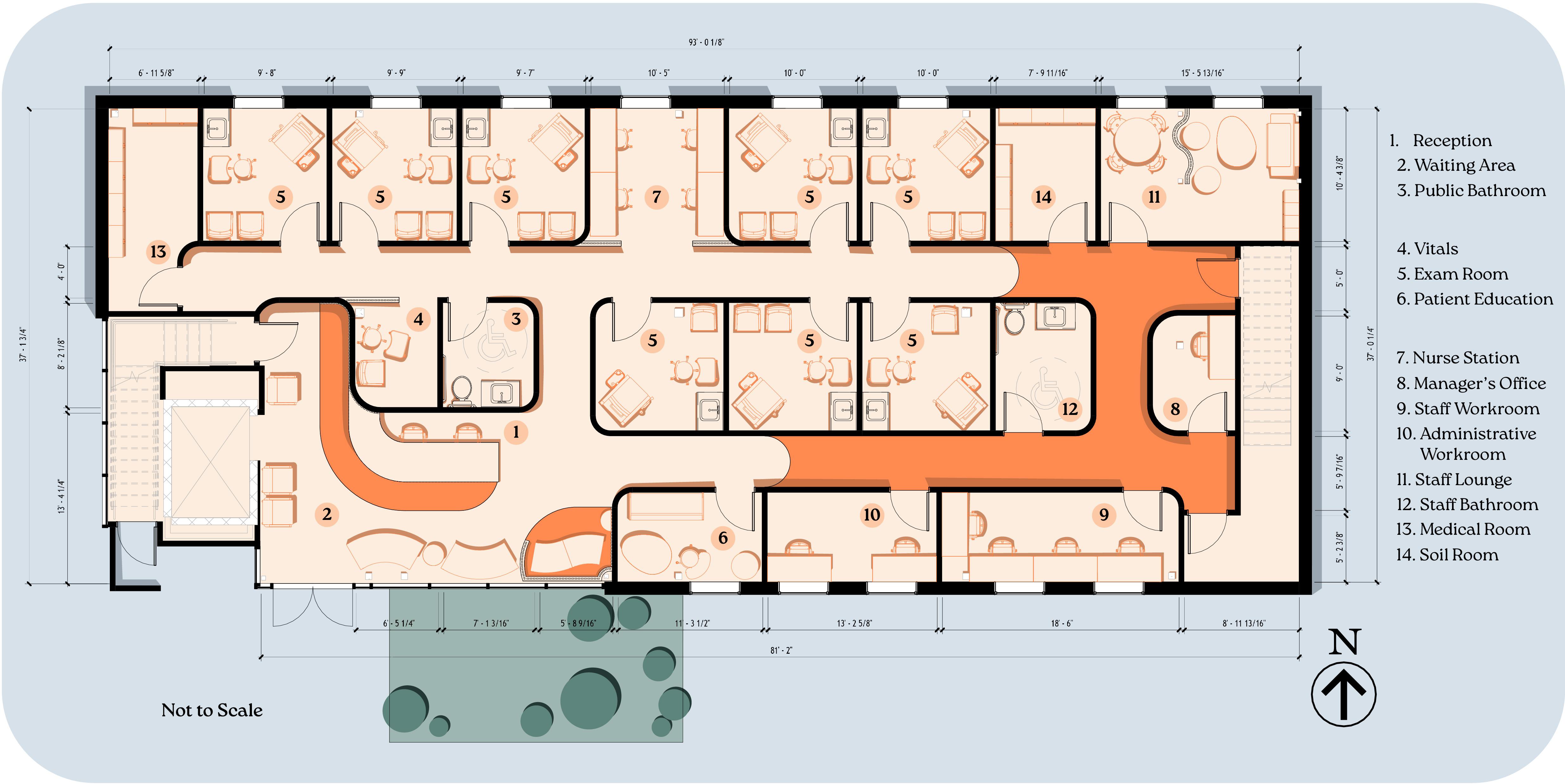 The plan’s layout considers the importance of providing clear separations between patient and staff zones. Additionally, a centralized nursing station grants staff quick access to each exam room while still being proximal to private employee spaces.