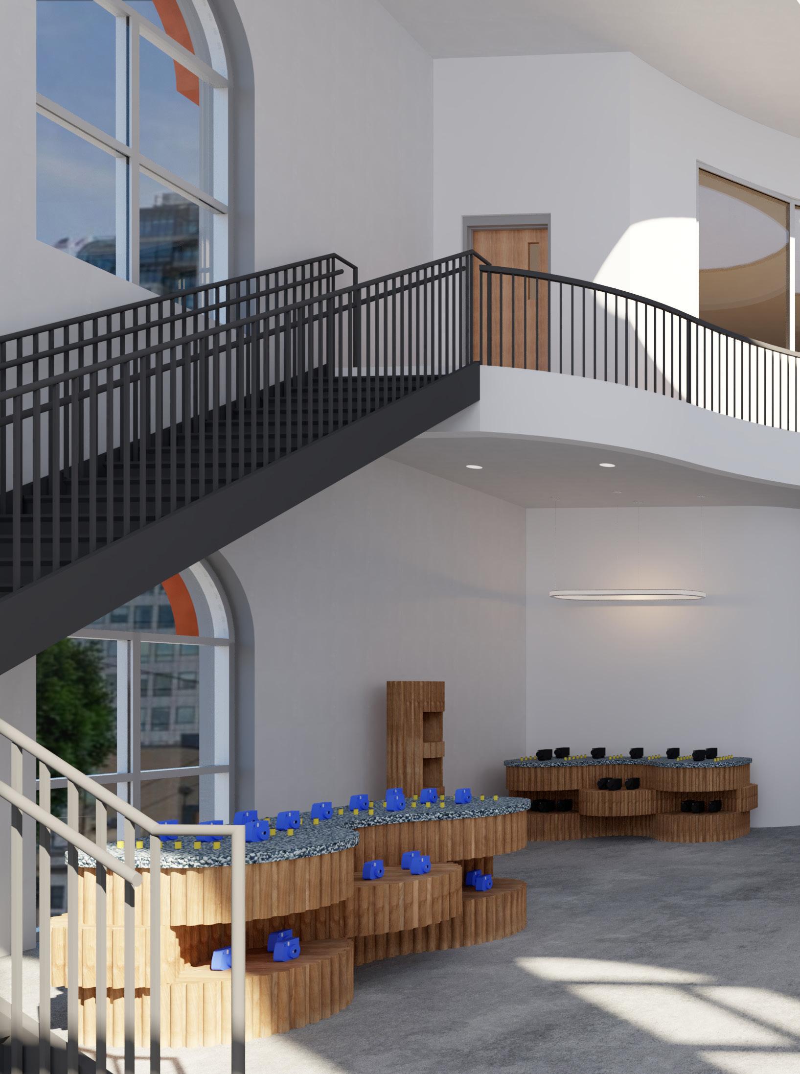 The space’s bold patterns and vibrant color palette excite users through its upbeat aurora, yet they are implemented in a sophisticated manner. The playful details are balanced by warm wood tones and various blank surfaces to refrain from overwhelming users.