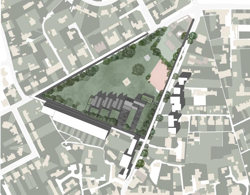 My material choice was also derived from the site, with reclaimed bath stone and wooden slatting in comination to mimic the park wall and surrounding trees. The landscaping used for this building is simple, yet reinforces the priciples behind the school; the pathing between blocks separates the classes into their respective yeargroups, and further paving on the east allows for seating and leads to entrance-ways in the building. This idea helps reinforce the block terrace motif.