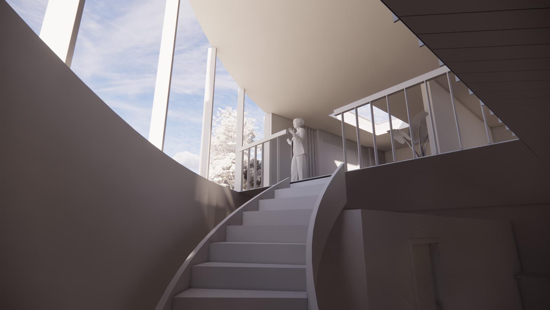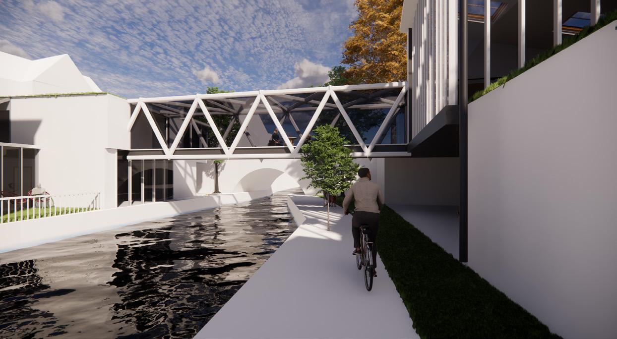 Creating an environment in a confined space, separated by a popular canal, aimed to use the separation to my advantage, creating a physical barrier between the public and private spaces of the house. The exhibition allows for large quantities of light to illuminate the space and the kitchen/dining area leads out straight onto the canal. The focal area of my residence is the bridge, which is a sculpture between the buildings, portraying the artist’s modern style, whilst allowing views through the glazed exterior.