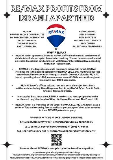 RE/MAX is a corporation that contributes to housing scarcity and gentrification worldwide. Domestically, they are a major player in raising the cost of living for renters and first-time home buyers. In Israel and Palestine, their business goes beyond the classic gentrification playbook. Israel’s occupation is a history of violent land grabs against the people of Palestine.