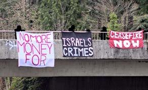 Demonstrators participated in an action on February 11th in solidarity with Palestine. They met at 1 p.m. at the Eastside St. SE Bridge (Woodland Trailhead Bathroom). When demonstrators arrived, there were three police cars at the meeting location, but they were there for another disruption that had occurred previously. Shortly after the police left, the group decided to continue with the banner drop and were there for just under 2 hours. The banner drop went smoothly, and the only event that occurred was an incident report vehicle that came around half way through the demonstration and warned the demonstrators that they could not have banners tied to the bridge but that in the future they can use poles to hold the banners up by the bridge. There was some nervousness around continuing safely, but the demonstrators decided to continue with the banner drop as planned. There is another banner drop planned for March 5th; the bridge location and exact time are still being discussed.