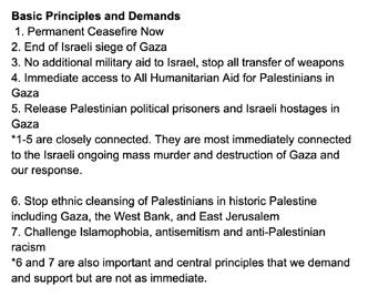 Join me as I uplift the demands of our Palestinian comrades: Ceasefire now, ceasefire permanently, end the siege on Gaza, release all Palestinian prisoners from Israeli prisons, end the occupation, end US aid to Israel. Palestine must be free, a freedom beyond our imagination fiercely and joyfully defying the walls that have been built around it.