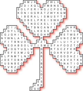 3) In diesem Setzkasten aus der Werkstätte von Johannes Gutenberg haben sich 5 wichtige Begriffe versteckt! Du findest sie schnell, wenn du senkrecht und waagrecht suchst! %%%%