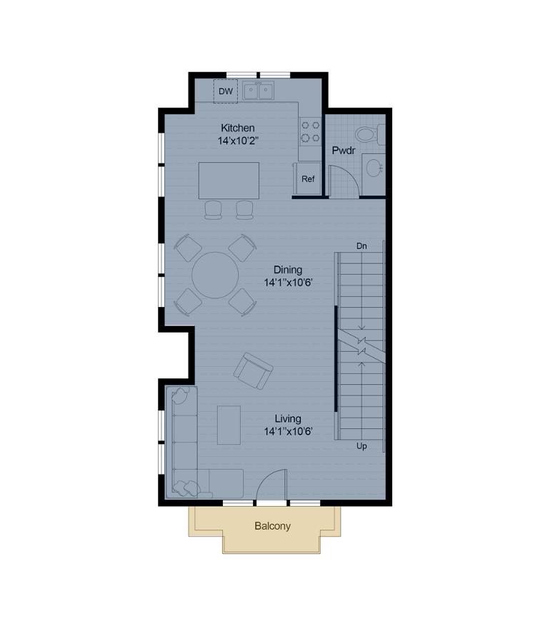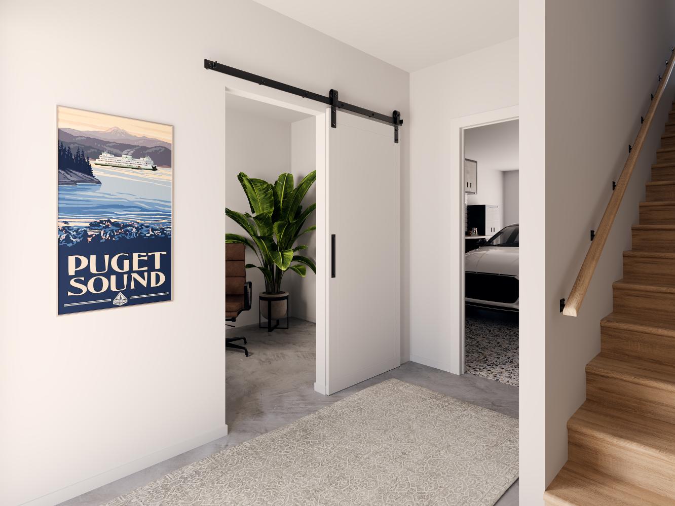 flex room for live/work optionality,an open-concept living room,dining area and gourmet kitchen on the main level,and two bedrooms with walk-in closets and private bathrooms perched on the top floor