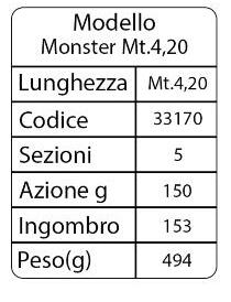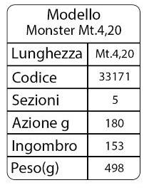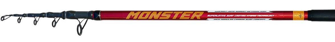 Monster Surf: Nuova telescopica realizzata in fibra di carbonio con un rapporto Qualità/Prezzo al dir poco Imbattibile. L’azione Fast Hybrid ottenuta grazie all’utilizzo di una cima in carbonio pieno, garantisce un’ eccellente sensibilità in pesca ma nello stesso tempo un’ottima potenza per poter raggiungere lontani Spot di pesca in estrema sicurezza di lancio Monta anelli Sic con trattamento Saltwater Disponibile in un’unica lunghezza, ma in ben due differenti azioni. Molto contenuta nell’ingombro per garantire comodità anche durante il trasporto