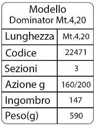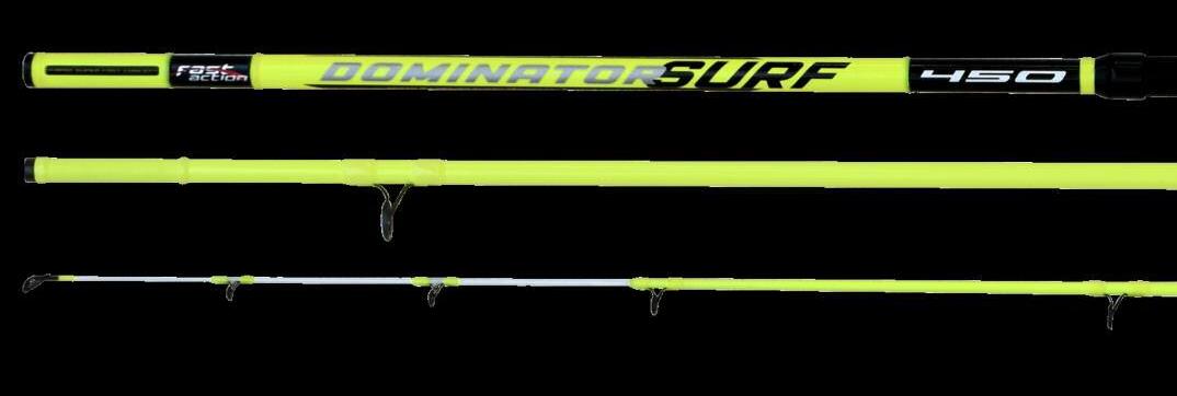 Dominator Surf: Da qualsiasi punto di vista la esaminiamo risponde a PIENISSIMI voti data anche la bellezza e la sportività delle sue serigrafie Si propone ad una fascia di pescatori medio esigenti, regalando grandi performace in pesca anche volendo considerare l’eccezionale rapporto Qualità/Prezzo Realizzata integralmente in fibra di carbonio, monta anellatura SIC con trattamento Saltwater. La sua azione è Hybrid grazie al cimino in carbonio pieno che le da grande sensibilità ed allo stesso tempo garantisce un’ottima risposta anche in fasi di lancio particolarmente impegnative. Disponibile in ben due misure Mt 4,20 e Mt 4,50