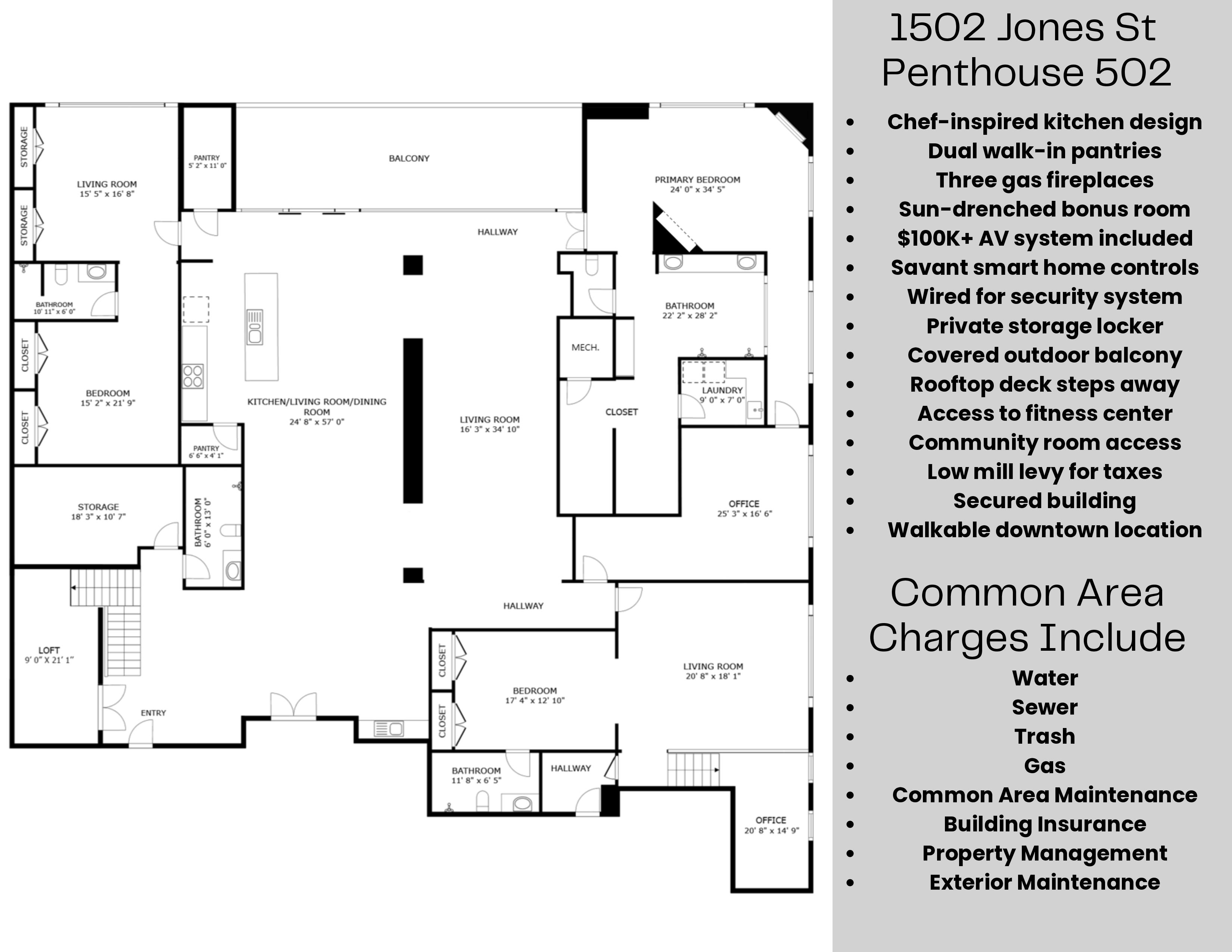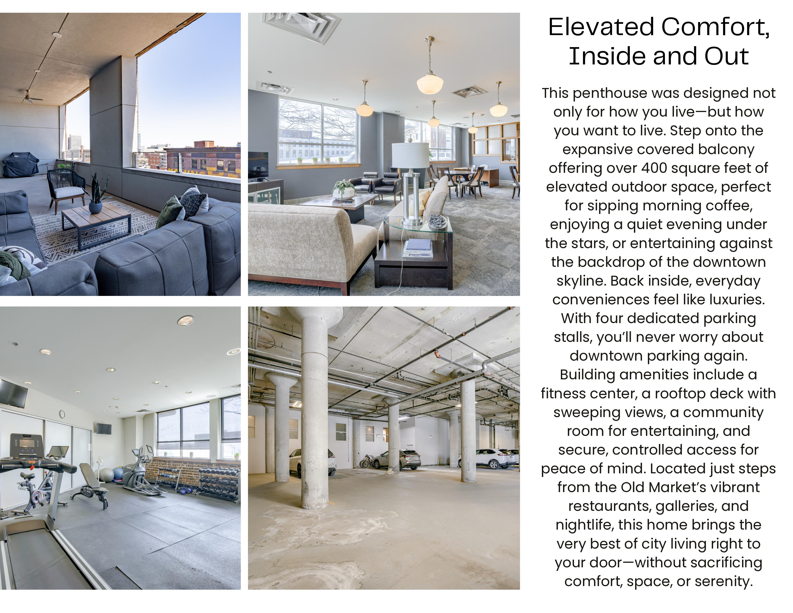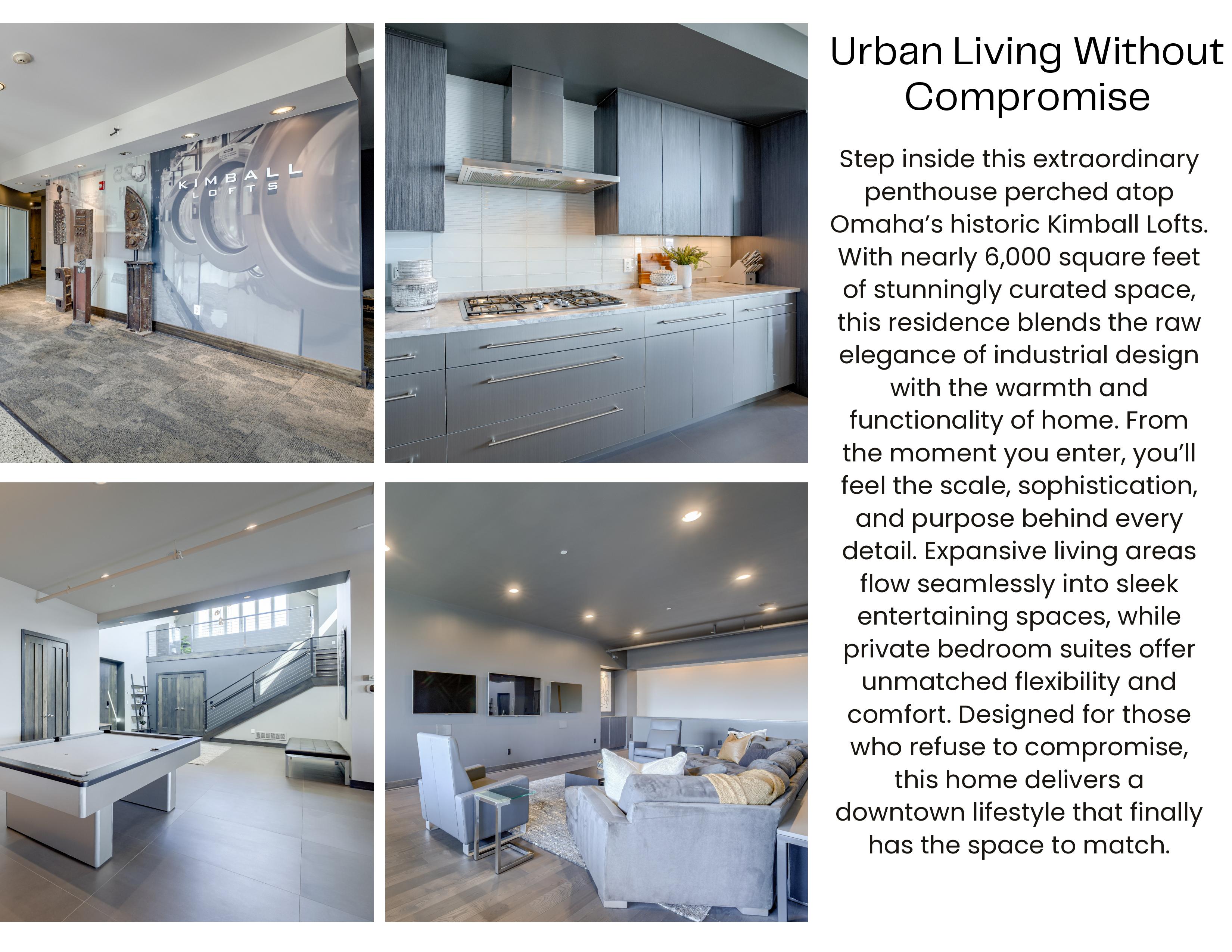 Welcome to an extraordinary penthouse that redefines downtown Omaha living. Perfectly positioned at the Kimball Lofts, this remarkable residence offers elevated space, sophistication, and flexibility rarely seen in the city. Designed for those who want it all, the thoughtfully curated floor plan includes three expansive bedroom suites, each with private living areas, luxurious en suite baths, and generous storage. The primary suite is a true retreat, featuring a spa-inspired bath with an oversized walk-in shower, private laundry, and one of the largest walk-in closets downtown.