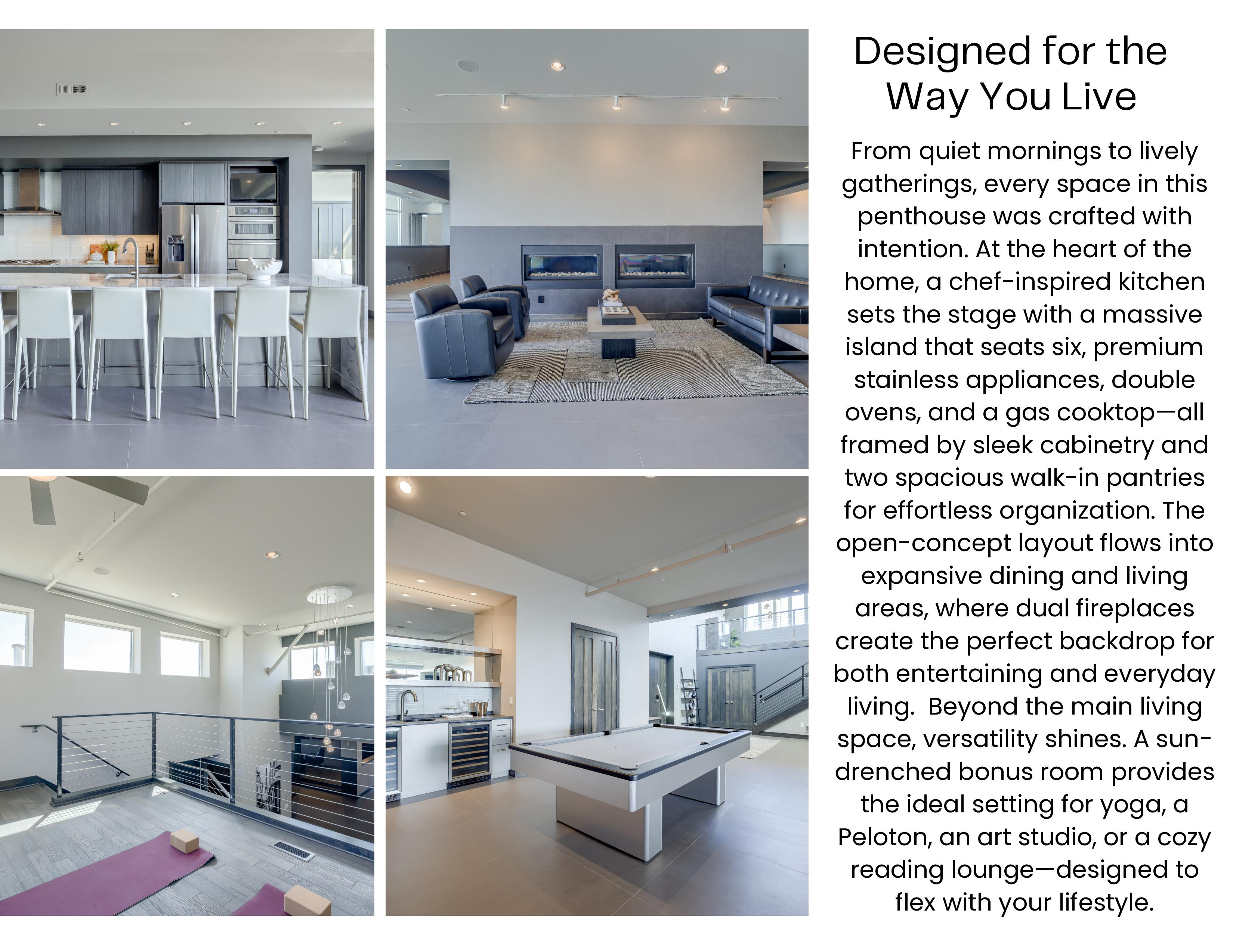 At the heart of the home, a chef-inspired kitchen stuns with a massive marble island, premium appliances, double ovens, gas cooktop, and dual pantries. An open flow into the dining and living spaces, complete with three gas fireplaces, creates the perfect setting for entertaining. Step outside to a 400+ sq. ft. covered balcony and enjoy sunset views over the skyline.