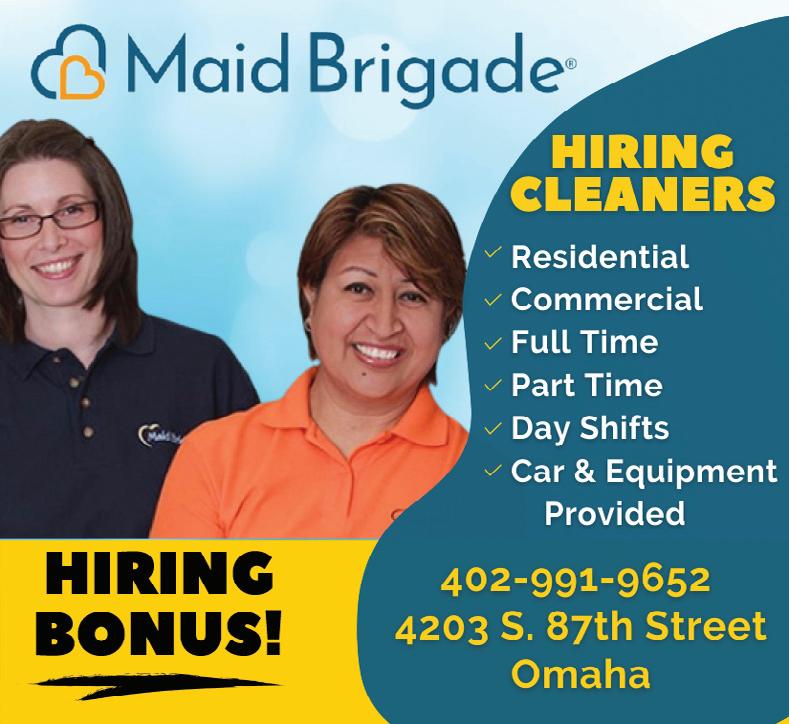 HOUSEKEEPERS $11 per hour for Motel 6, full-time, 7 days a week, reliable transportation, 10560 Sapp Brothers Drive, 402-896-6868. $2500 BONUS for new hires, $14 per hour starting pay, awesome benefits! Hiring for multiple positions. James Skinner Baking Open interviews, Monday-Sat, 8am-12pm, 4657 G Street, Omaha. CAR LOT PERSON needed to change parts, check fluids, etc. Fulltime, Monday- Saturday, get paid weekly, 401K, profit sharing, must have valid driver’s license and mechanical knowledge. Located in Midtown. Call Red at 402-558-7400