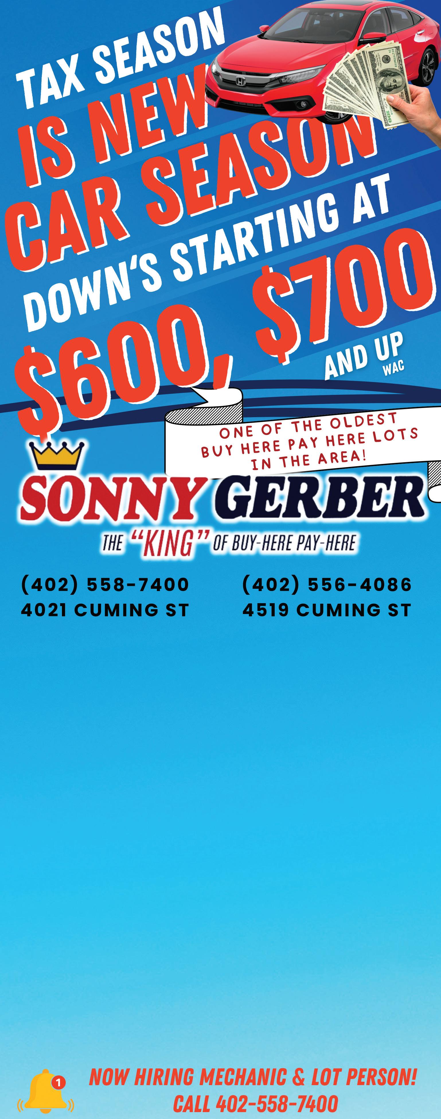 Apply in person to Nick at Paul Gerber Auto Sales, 3423 N. 72nd St. Omaha.