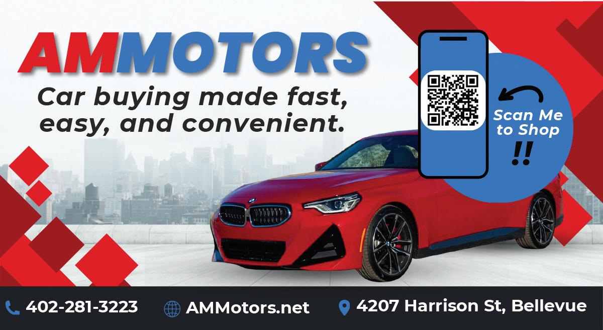 $350 & UP! Any junk vehicle, running or not, Lincoln area, 402-2191311. LOADING RAMPS for pickup, heavy duty, galvinized, 402-983-4901. REMOTE STARTS for as little as $199 installed on most vehicles. Creative Auto Solutions 712-2563454. $0-$1200 PAYING cash for unwanted vehicles, call 24/7; also towing, roadside assistance & more; 402-590-7315.. $350 & UP! Any junk vehicle, running or not, Lincoln area, 402-2191311. BUYING JUNK cars, paying top dollar, running or not, 402-510-4480. Omaha Metro area only. BUYING VEHICLES: paying top dollar for vehicles that run. Paul Gerber Auto Sales, 3423 N. 72nd St., 402-571-1335. CADILLAC SEVILLE, ‘97, STS, white, 135K miles, leather, #844915, $1999 cash. Paul Gerber Auto Sales, 3423 N. 72nd St., 402-571-1335. CHEVY COBALT, ‘07, 4 cylinder, auto, pw, pl, alloys, tan, 160k miles, #135RPR, as low as $1000 down wac. Paul Gerber Auto Sales, 3423 N. 72nd St., 402-571-1335. CHEVY IMPALA, ‘06, LS, maroon, V6, pw, pl, #147103, as low as $1000 down wac. Paul Gerber Auto Sales, 3423 N. 72nd St., 402-571-1335. CHEVY SONIC, ‘17, LT, automatic, $6995. Bellevue Motors, 209 Fort Crook Rd. North, 402-916-1881, bellevuemotors.net DODGE STRATUS, ‘03, 2 door, SE, V6, auto, pw, pl, alloys, light blue, extra clean, #136095, as low as $1000 down wac. Paul Gerber Auto Sales, 3423 N. 72nd St., 402-571-1335. FORD FIVE Hundred, ‘05, Limited, leather, V6, pw, pl, alloys, gray #14937R, as low as $1000 down wac. Paul Gerber Auto Sales, 3423 N. 72nd St., 402-571-1335. FORD FOCUS, ‘08, 4 door, 4 cylinder, auto, pw, pl, gas saver, #284334, as low as $1000 down wac. Paul Gerber Auto Sales, 3423 N. 72nd St., 402-571-1335. ONLINE at american classifiedsnebraska.com GET YOUR deduction ahead of the year end. Donate your car, truck or SUV to assist the blind and visually impaired. Arrange a swift, no cost vehicle pickup and secure a generous year end tax credit. Call Heritage for the Blind today at 1-855-9777030 today! (mcn) GOT AN unwanted car? Donate it to Patriotic Hearts. Fast free pick up, all 50 States. Patriotic Hearts’ programs help veterans find work or start their own business. Call 24/7: 844-588-6535. (mcn) KIA OPTIMA, ‘12, Hybrid LX, 111,479 miles, $6995. Bellevue Motors, 209 Fort Crook Rd. North, 402-9161881, bellevuemotors.net LINCOLN TOWN CAR, ‘96, Cartier, leather, factory alloy wheels, maroon, pw, pl, #634943, as low as $650 down wac. Paul Gerber Auto Sales, 3423 N. 72nd St., 402-571-1335. NEED A VEHICLE? Low monthly payments, as little as No Money Down, wac. Call or text LA Auto’s 402-215-3906, Omaha. PAYING cash top dollar, buying vehicles running or not, no title necessary, 402-8503090. SAME DAY PICKUP, cash paid for junk cars, up to $800, 402-612-8636, 402-345-1676. “BUYER BEWARE” Some of the following ads come to us from across the nation. Please check them out before sending money. DONATE YOUR car to Veterans today, help and support our Veterans, fast free pick up, 100% tax deductible, call 1-800-2450398. (ads) AMERICAN Classifieds. Over 8,500,000 readers strong nationally. Everything Automotive FENDER BENDERS? Call For An Appointment 13748 F Street, Suite 900 • 402-397-1568 Monday - Friday 8am-5pm • dentcraftersofomaha.com We work with All Insurance Companies FENDER BENDERS? We work with All Insurance Companies Auto Parts PICKUP BOXES All Makes 1967 - 2024 RUST FREE FROM TEXAS In Business 28+ Years Call Chip For Appt. 402-660-7330 trailers All Types: Utility • Dump Motorcycle Construction GARDNER TRAILERS 6525 Railroad Ave., Omaha Call Jack To Save $$ 402-731-6776 Family Owned Business Since 1975 Full Service Repair Facility Minor Fabrications Baskets, Racks & Much More Professional Advice DOT Inspection Warranties We Only Carry Trusted, Reliable Name Brand Trailers 2244 N. Cotner Blvd, Lincoln 402.499.0911 JPKinvestmentmotors.com INVENTORY ‘07 BMW X5, 4.8i, AWD . . . . . . . . . . . . . . . . . $6,495 ‘98 BUICK REGAL LS, 4 door . . . . . . . . . . . . $2,695 ‘08 BUICK LUCERNE CX, 4 door sedan . . . . $2,495 ‘04 CADILLAC SRX WAGON, blue . . . . . . . . $2,995 ‘11 CHEVY EQUINOX LTZ, AWD, very sharp . . . $7,995 ‘07 CHEVY SILVERADO, Ext. Cab, 2x4, sharp . . $7,995 ‘09 CHEVY EQUINOX LT, AWD, SUV . . . . . . $3,995 ‘06 CHEVY MALIBU LTZ, 4 door sedan . . . . . $2,995 ‘03 CHEVY AVALANCHE 4x4, 4 door . . . . . . $4,995 ‘15 CHRYSLER TOWN & COUNTRY, black . . $6,995 ‘12 CHRYSLER TOWN & COUNTRY, Limited . $4,995 ‘07 DODGE DURANGO LIMITED, 4WD . . . . . $4,695 ‘10 FORD EXPLORER SPORT TRAC XLT, 4x4 $7,295 ‘13 FORD FOCUS, sapphire blue . . . . . . . . . $5,995 ‘13 FORD EXPLORER XLT, 4 door, SUV . . . . $7,495 ‘99 HONDA CR-V EX, AWD . . . . . . . . . . . . . . $3,995 ‘12 HONDA PILOT EX-L, 4x4, DVD . . . . . . . . $9,995 ‘19 HONDA CIVIC SPORT, dark gray, 90k . $18,995 ‘14 HYUNDAI ELANTRA SE, 4 door, gray . . . $8,995 ‘16 HYUNDAI SANTA FE LIMITED, AWD . . $11,995 ‘06 KIA SORENTO, maroon . . . . . . . . . . . . . . $3,695 ‘13 KIA SOUL, lime green . . . . . . . . . . . . . . . $6,995 ‘16 KIA OPTIMA, 4 door, sapphire blue . . . $10,995 ‘19 KIA FORTE, under book, white, leather . . $7,995 ‘17 KIA SPORTAGE . . . . . . . . . . . . . . . . . . . $11,995 ‘16 KIA SOUL, 4 door, Crossover . . . . . . . . . $8,995 ‘15 KIA SPORTAGE, AWD . . . . . . . . . . . . . . $11,995 ‘09 NISSAN MURANO, AWD . . . . . . . . . . . . $7,495 ‘14 NISSAN ALTIMA 2.5 SV, 4 door sedan . $6,995 ‘10 NISSAN VERSA, silver . . . . . . . . . . . . . . $5,995 ‘01 NISSAN XTERRA, red, extra sharp . . . . . $3,495 ‘06 PONTIAC G6, black . . . . . . . . . . . . . . . . . $4,995 ‘07 SATURN OUTLOOK XR, 4 door SUV . . . $4,995 ‘07 TOYOTA MATRIX, 5 speed, gray . . . . . . . $5,995 ‘08 VW EOS KOMFORT, silver . . . . . . . . . . . $4,995 No Salvage Titles No Auction Vehicles www.UPULLITNE.com • OPEN 7 DAYS • Buying Cars. Selling Parts. North Omaha: 1405 Grace St. • (402) 342-0831 South Omaha: 5600 S. 60th St. • (402) 734-602