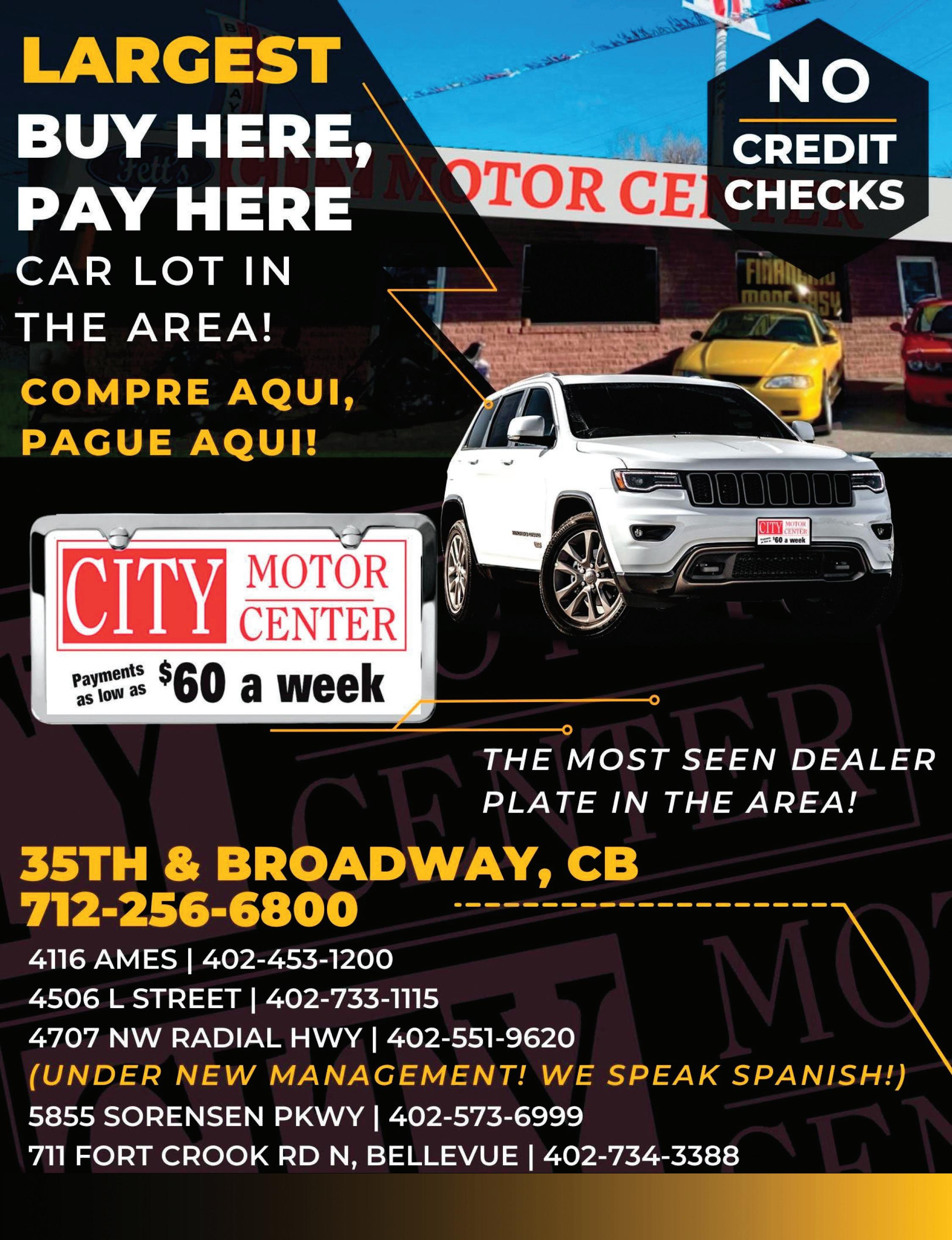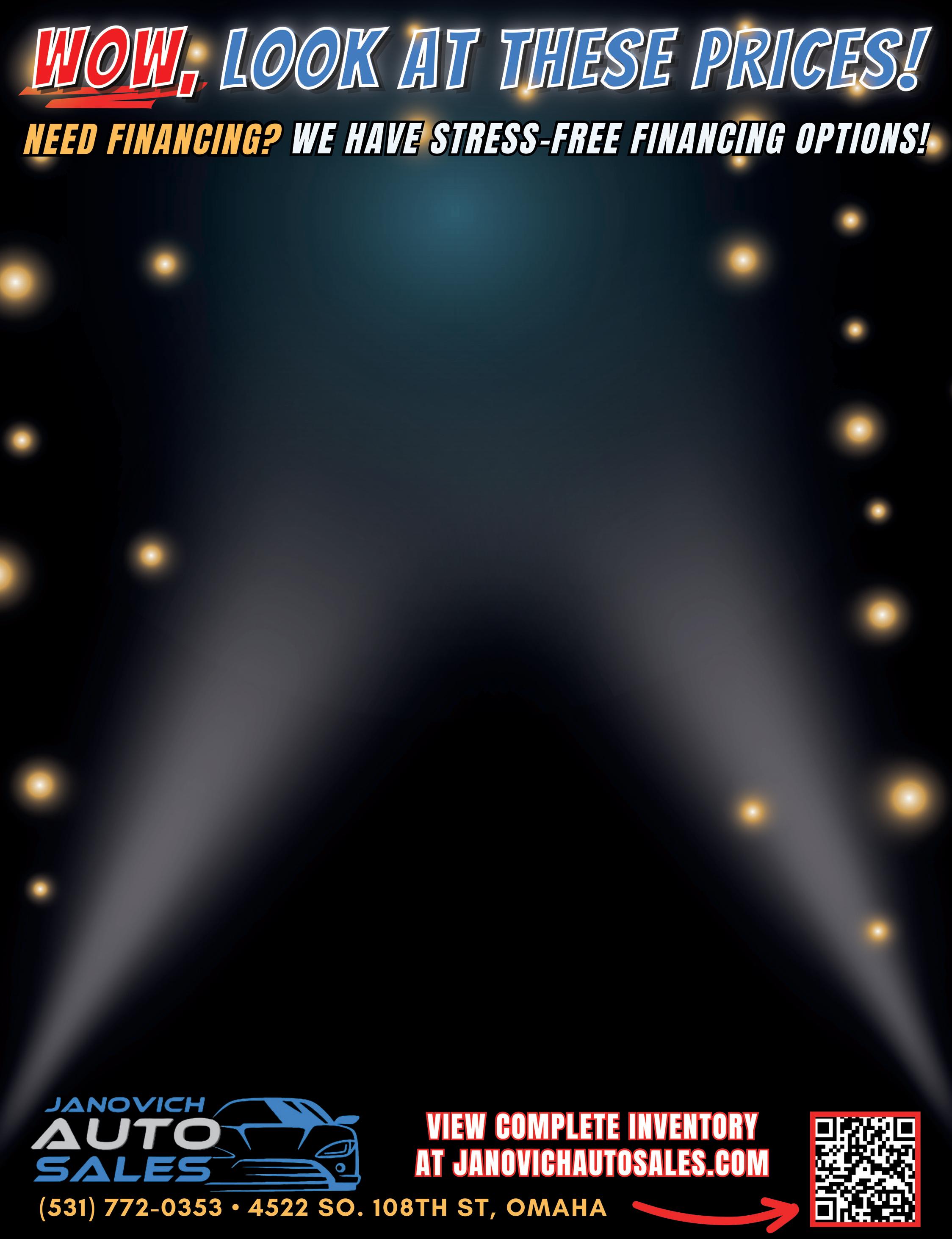 $15,499 $23,999 $13,499 $24,999 $23,499 FINANCING AVAILABLE!* No Credit • Bankruptcy • Good Credit • First Time Buyers Tax Identification Numbers No Impact On Credit Score! SSN Not Required! Control Your Payments! autoworldomaha.com Open: Mon., Tues., Thurs. 9-8; Wed. & Fri. 9-6; Sat. 9-5*wac (402) 504-1804 337 S. 72nd St. NOW OPEN! 2nd Sales & Service Location! 1209 Fort Crook Rd So. Bellevue ‘21 CHEVY SPARK 8k miles, gas saver, bluetooth ‘18 CHEVY SILVERADO 113k miles, backup camera, bluetooth ‘17 CHEVY MALIBU 94k miles, bluetooth, back up camera ‘12 CHEVY IMPALA 167k miles, leather interior, remote start ‘15 CADILLAC SRX 82k miles, sunroof, AWD, leather interior ‘14 FORD TAURUS 95k miles, SHO ED, leather, sunroof ‘17 FORD FUSION 79k miles, back up camera, cloth seats ‘20 FORD F-150 94k miles, cloth seats, back up camera ‘12 VW TIGUAN 104k miles, back up camera, cloth seats ‘15 MAZDA 3 71k miles, back up camera, bluetooth ‘17 GMC YUKON 103k miles, 3rd row, back up camera ‘15 GMC CANYON 88k miles, cloth seats, Crew cab rs $14,999 $16,499 GET PRE-QUALIFIED FOR FINANCING NOW $9,999 $14,999 $26,999 Call us today about our fresh selection of affordable vehicles from $1000 - $5000 $5,999 $15,999 May 3, 2024 AUTO ALBUM Page 25