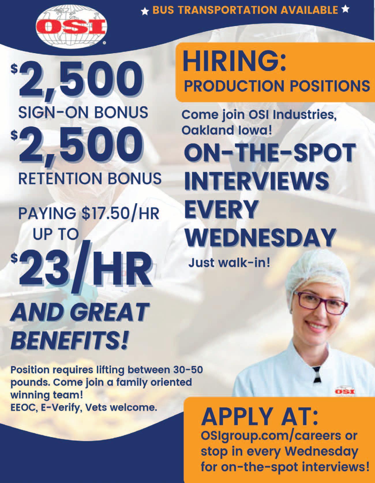 COMPETITIVE PAY with great benefits. OSI food supplier in Oakland, IA. is hiring for multiple positions and shifts. Bus transportation available. Apply at www.OSI group.com/careers