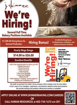 $2500 BONUS for new hires, $14 per hour starting pay, awesome benefits! Hiring for multiple positions. James Skinner Baking Open interviews, Monday-Sat, 8am-12pm, 4657 G Street, Omaha.