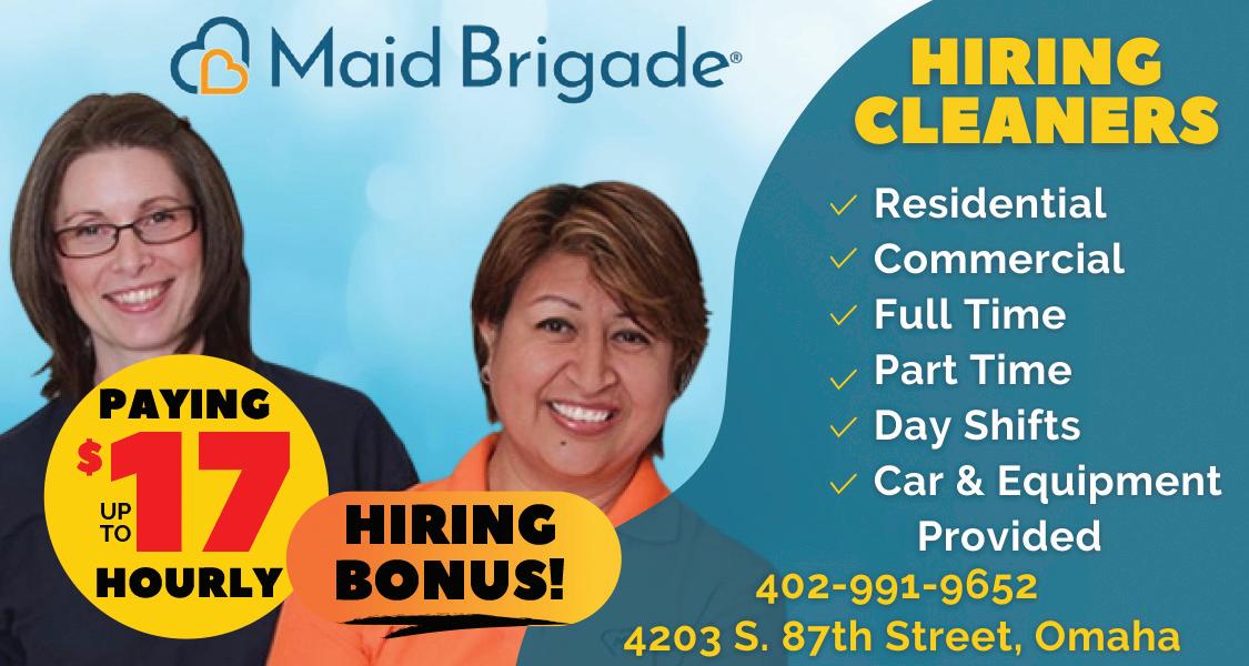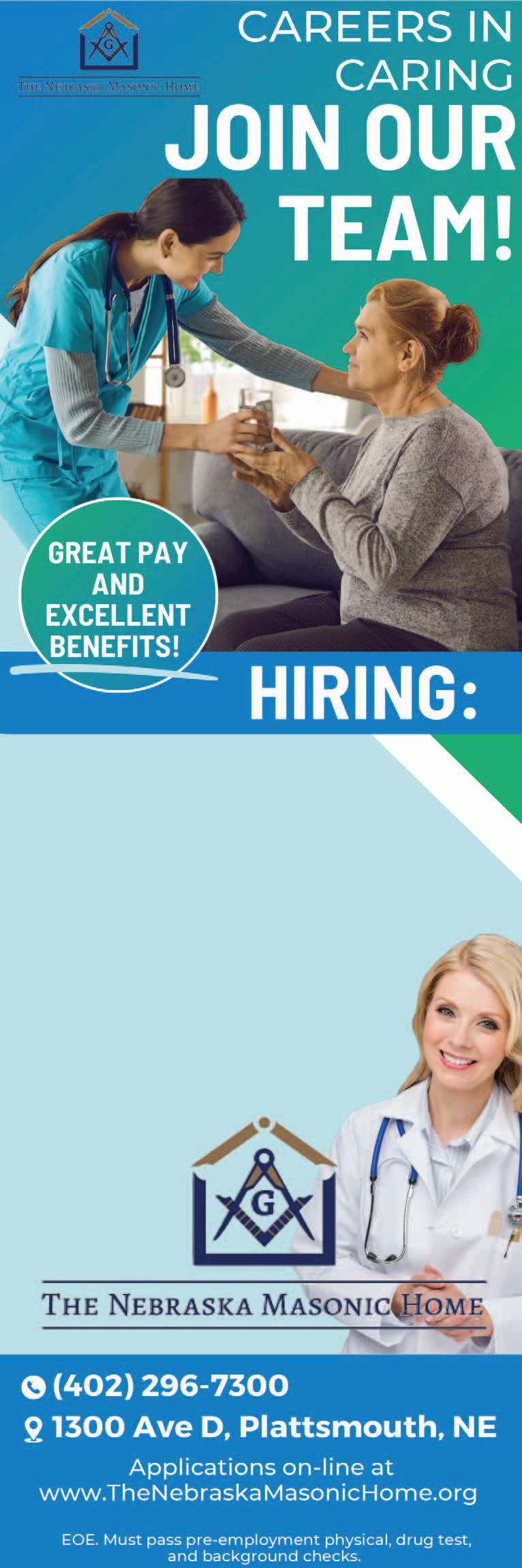 GREAT PAY and benefits. The Nebraska Masonic Home is hiring RN’s, LPN’s, CNA’s, CMA’s, housekeepers, floor technicians, sanitation monitor. 402-2967300.