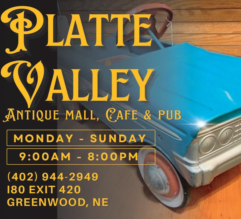 ANTIQUES, CCollectibles crafts and more! Open daily 9am to 8pm, Platte Valley Antique Mall, Café & Pub, 180 Exit 420, Glen wood, 402-944-2949.