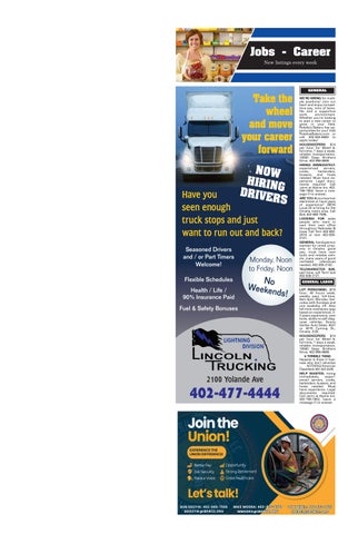 SAFE STEP, North America’s #1 Walk-in tub. Comprehensive lifetime warranty. Top of the line installation and service. Now featuring our free shower package & $1600 off, limited time, financing available, 1-855-417-1306 (ads) KING SHEET SET, gold, sheets never used, pillow cases gently used, $10, 402-537-4387 COMPLETE DRYWALL Service, we specialize in finished basements. When quality counts, call, text or email for a free estimate, Service 1 Drywall, 402214-4431, josephmcavoy3 @gmail.com. Senior & Military discounts. Have a blessed day.