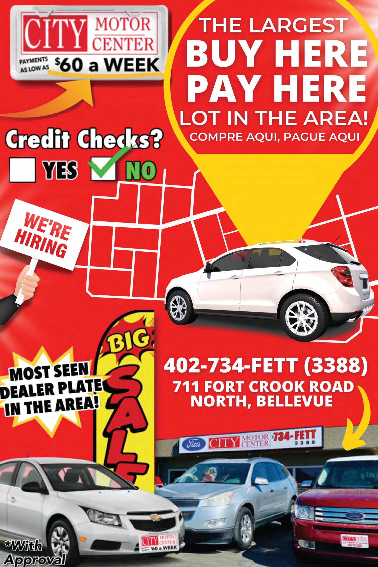 4 door, auto, air, pw, pl, 113k, gas saver, it’s bluetiful! #151813 ‘07 Chevy Trailblazer LTZ, 4WD, 141k miles, leather, moonroof, V6, light green, spotless, #325726 ‘19 Ford Escape, AWD, 114k, SE, pw, pl, alloys, silver, #B60068 ‘15 Ford Super Crew, 4 door, pw, pl, boards, Eco-Boost engine, white, #F17188 MANY MORE TO CHOOSE FROM! THIS WEEK’S SPECIALS NOW BUYING CARS, TRUCKS & VANS INSTANT CASH FOR YOUR USED VEHICLE Limited Time Only Se Habla Espanol Credit Cards Accepted *WAC. Includes Doc. Fee PAY HERE* BUY HERE* 3423 N. 72nd St. (402) 571-1335 Many More Cars, Trucks & Sport Utilities To Choose From! paulgerberautos.com ‘04 FORD F-150 RTO5123 ‘11 KIA FORTE RTO5204 ‘08 FORD RANGER RTO5024 ‘02 DODGE NEON RTO5296 NEVER BE “UPSIDE DOWN” IN A CAR LOAN AGAIN Your payment includes EVERYTHING listed here: ✔ Nebraska Sales Tax & Personal Property Tax ✔ License Plates & Registration Fees ✔ Oil and filter Changes Every 4,000 miles ✔ Engine, Drive Train and Transmission Warranty ✔ 24-Hour Roadside Assistance!*** You may return your vehicle at ANY TIME to Upgrade, or just give it back without penalty!* Plus! Nice Cars For Good People 402-991-4949 4310 L Street • Omaha, NE 68107 *Origination Fee **Except for excess wear and tear. Excess mileage excluded. ***With Vehicle Purchase, See Store for Details A Rated What You Need to Bring: 1. A valid Nebraska or Iowa drivers license. 2. Proof of a job and/or verifiable income. 3. Proof of your address (like an electric bill in your name) 4. Money down or a clear trade title. 5. Five complete references including their name, relationship, address and phone number. That’s It! You are Approved! Bring these items with you and leave in the car, truck or SUV of your choice! ‘08 HYUNDAI SANTA FE RTO5311 ‘14 KIA SOUL RTO5174 ‘12 DODGE AVENGER RTO5012 ‘11 NISSAN SENTRA RTO5313 ‘06 SUBARU LEGACY RTO5301 ‘06 GMC ENVOY RTO5176 NOW $750* NOW $1000* NOW $500* NOW $600* NOW $500* NOW $500* NOW $750* NOW $500* NNOW $500* NOW $750* ‘13 HYUNDAI ELANTRA RTO5031 NOW $750* ‘09 PONTIAC G6 RTO5046 NOW $500* ‘12 FORD FOCUS RTO5220 NOW $750* Origination Fees On Select Vehicles ‘12 CADILLAC CTS RTO5300 NOW $750* ‘12 CHEVY MALIBU RTO5277 NOW $750* ‘09 PONTIAC G-6 RTO5112 NOW $750* 1/2 OFF SALE ‘14 CHRYSLER 200 RTO5124 NOW $500* ‘15 BUICK VERANO RTO5291 NOW $1000* ‘14 FORD FOCUS RTO5160 NOW $500* ‘12 CHEVY TRAVERSE RTO5235 NOW $500* ‘07 BMW X3, AWD . . . . . . . $8,995 ‘08 BUICK ENCLAVE . . . . . $8,995 ‘06 CHEVY 2500, 4x4, 64k miles $8,995 ‘04 CADILLAC SRX $4,995 ‘11 CHEVY HHR $5,995 ‘11 CHEVY MALIBU $7,995 ‘94 CHEVY C/K 1500 . . . . . $4,995 ‘07 DODGE CALIBER . . . . . $4,995 ‘98 DODGE RAM 1500 . . . . $4,695 ‘07 DODGE DURANGO . . . $4,695 ‘12 FORD FUSION . . . . . . . $6,995 ‘03 FORD FOCUS . . . . . . . $2,995 ‘07 FORD FOCUS . . . . . . . $3,995 ‘10 FORD FUSION $7,995 ‘08 GMC ACADIA, AWD $8,995 ‘98 JEEP CHEROKEE $6,995 ‘14 KIA SOUL . . . . . . . . . . $9,995 ‘08 MERCURY MILAN . . . . $4,995 ‘05 TOYOTA HIGHLANDER $4,495 ‘08 VOLKSWAGEN EOS . . . $8,995 ‘10 VW NEW BEETLE . . . . . $8,995 ‘06 VOLKSWAGEN JETTA . $4,995 2244 N. Cotner Blvd Lincoln 402.466.7744 JPKinvestmentmotors.com 2035 Yolande•Lincoln 402-477-4200 • 877-611-4707 Open Mon.-Fri. 8am-5pm Larry’s Used AUTO PARTS Keep it running at it’s best with quality USED AUTO PARTS Domestic & Foreign Huge Selection! BUYING VEHICLES of all types SAME DAY PICKUP Cash paid for junk cars, up to $800, 402-6128636, 402-345-1676. BUYING VEHICLES Running or not, no title necessary, paying cash top dollar, 402-850-3090. PAYING CASH TOP DOLLAR Buying vehicles running or not, no title necessary, 402-8503090. $350 & UP! Any junk vehicle, running or not, Lincoln area, 402-2191311. BUYING JUNK CARS Paying top dollar, running or not, 402-5104480. Omaha Metro area $0-$1200 PAYING CASH For unwanted vehicles, call 24/7, 402-590-7315. CASH PAID For junk vehicles with title. Call Rich’s All American Towing, 402216-8695 Omaha. TOYIN’S TOWING We tow, tire change, jumb starts, lock outs and winching. Also buying scrap and wrecked cars, 531-800-7010. Automotive Directory JUNK CARS JUNK CARS TOWING