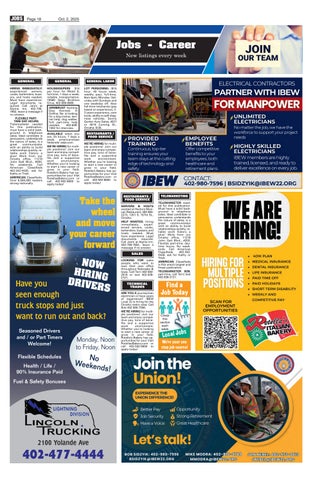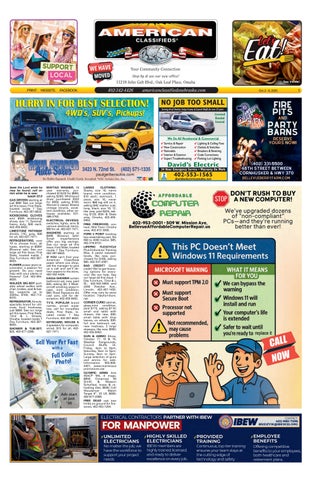 ‘17 Wrangler, Arctic Edition, 17k miles, power boards, amusement lift, 24’s sitting on 35” tires, $15k in extras, $44,995. Ziepke Motors, LLC. 8605 Q, 402-813-9301, ziepkemotors.com Page 7