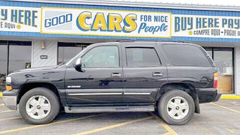 LIMO, super stretch $8495 ‘98 CHRYSLER CONCORDE, V6, auto $2495 ‘08 DODGE AVENGER, 4 cyl., auto $2895 ‘08 FORD FUSION, 4 cyl., auto . . . . . . . . . . . . . $2795 ‘04 DODGE DURANGO 4x4, 3rd row . . . . . . . . . $2895 ‘07 CHEVY SUBURBAN 4x4, 3rd row $5995 ‘06 NISSAN ALTIMA 2.5XL, auto $2495 ‘11 CHEVY AVEO, auto, 116k miles $3495 ‘05 CHEVY COBALT, 90k miles $2795 ‘07 PONTIAC G6, sporty $2995 ‘99 MERCURY GRAND MARQUIS . . . . . . . . . . . $1995 ‘04 CHRYSLER SEBRING, 4 cyl., cold air . . . . . $1895 ‘06 CHEVY MALIBU, 4 cyl., auto $1995 ‘96 LEXUS ES300, luxury $1895 ‘01 OLDS ALERO, 4 cyl., auto $1395 ‘03 PONTIAC SUNFIRE, 4 cyl., auto $1695 $7995 ‘11 MINI COOPER, Clubman $5695 ‘15 KIA OPTIMA $4995 ‘13 FORD ESCAPE, 4x4 $5995 ‘11 CHEVY TRAVERSE 4x4 $5795 $6295