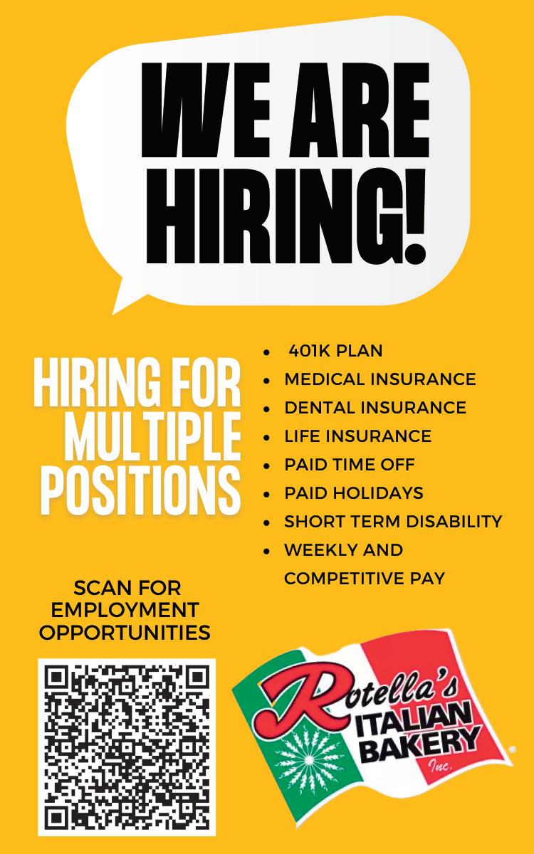WE’RE HIRING for multiple positions! Join our team and enjoy competitive pay, tons of benefits and a supportive work environment. Whether you’re looking to start a new career or grow in your field, Rotella’s Bakery has opportunities for you! Visit RotellasBakery.com or call 402-592-6600 to apply today!