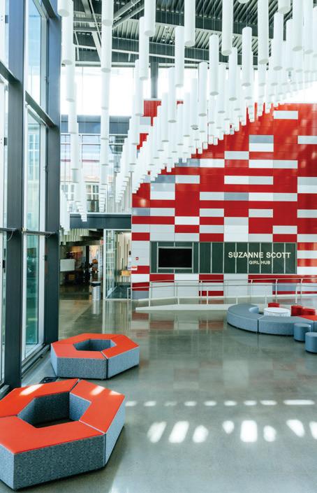 This interior shot showcases the Katherine Fletcher Center, the award-winning multimillion-dollar space created for Girls Inc. by Morrisey Engineering, architectural firm AO*, Lund-Ross Constructors, and All Makes Office Furniture + Technology.