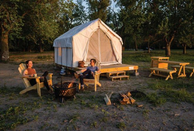 The central part of the county features two major recreation areas along the Platte River border. Platte River State Park campers can pitch a tent or enjoy cozy accommodations in charming vintage cabins or more luxurious “glamping” cabins. The park also features a beautiful waterfall, spray park, scenic hiking and biking trails, and two observation towers that provide a breathtaking view of the Platte River Basin. Visitors can also enjoy guided horseback rides, fishing and paddleboating, concessions, a covered picnic shelter available for rental, an amphitheater that hosts free naturalist presentations during the summer months, and more. The park is open yearround. Fun fact: Platte River State Park was formerly two separate camps: Harriet Harding Campfire Girls Camp and Camp Esther K Newman. Louisville State Recreation Area contains five sandpit lakes for swimming, fishing and non-power boating; provides canoe access to the Platte River; and features a new floating playground. Campers and RVers are welcome, and amenities include picnic sites and a playground, along with upgraded showers and restrooms.