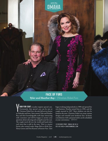 began working independently in 1989 and opened his own business. Heather joined him in 1996, and the couple married in 1997. Their children can also be found at the store. Christian Nobel can create custom designs and remodel your heirloom furs. In-home O consultations with a personal stylist can be scheduled at your convenience 129 REGENCY PKWY. OMAHA, NE 68114 402-343-9406 • CHRISTIANNOBEL.COM